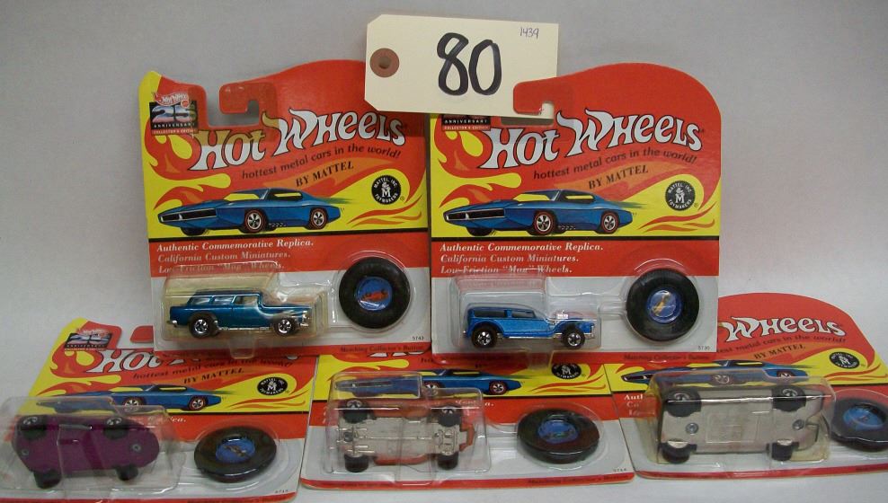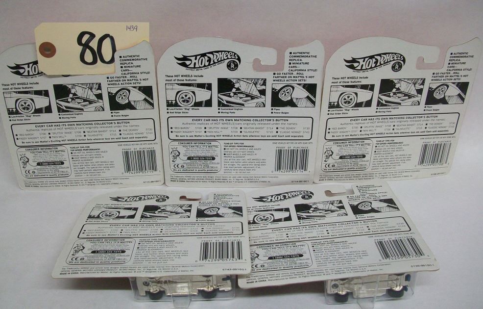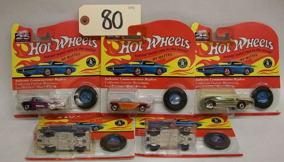 Hot Wheels 25th Anniversary Die Cast Cars-Series C (1993) 1:64 size, in packages Set of 5 Nomad (5743) Aqua, with matching Collector's Splittin' Image (5708) Olive, with matching Collector's Button Beatnik Bandit (5714) Orange, with matching Collector's Button