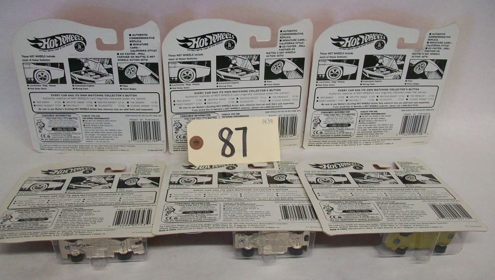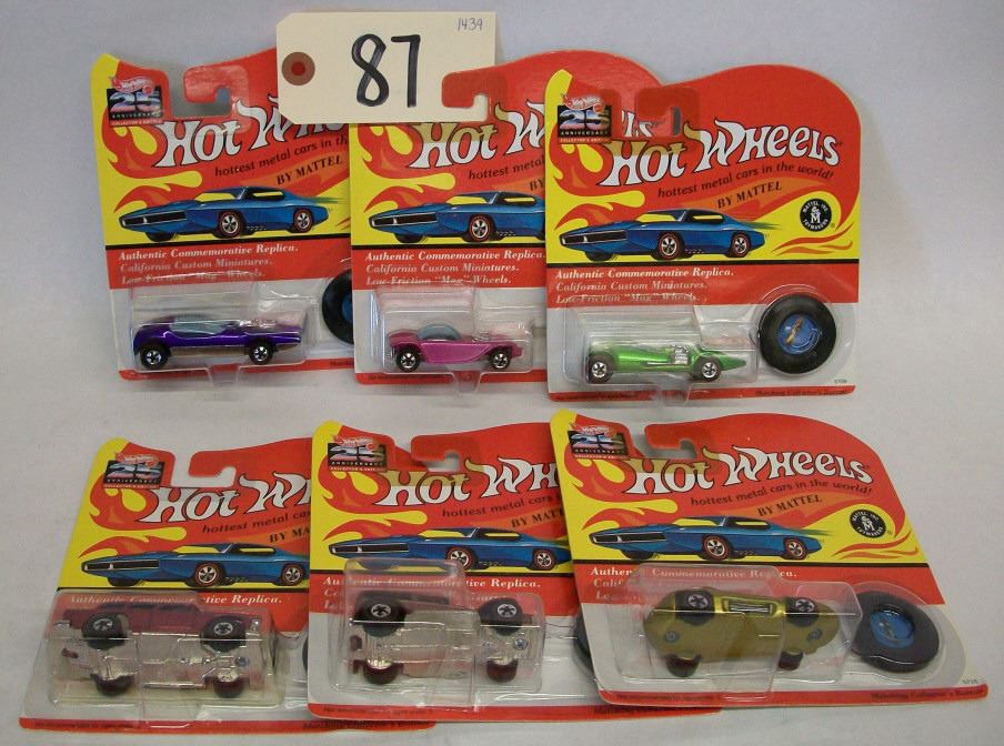 Hot Wheels 25th Anniversary Die Cast Cars-Series I (1993) 1:64 size, in packages Set of 6 Nomad (5743) Red, with Matching Collector's Splittin' Image (5708) Purple, with Matching Collector's Button Beatnik Bandit (5714) Pink, with Matching Collector's Button Twin Mill (5709) Light Green, with Matching Collector's Button