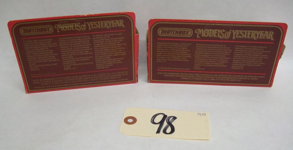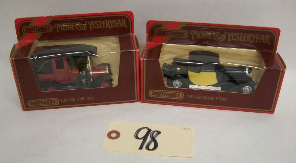 Matchbox Models of Yesteryear, in boxes Y24 1927 Bugattit 44 (1:38 size) Black & Yellow Y28 1907 Unic Taxi (1:42 size) Red & Black