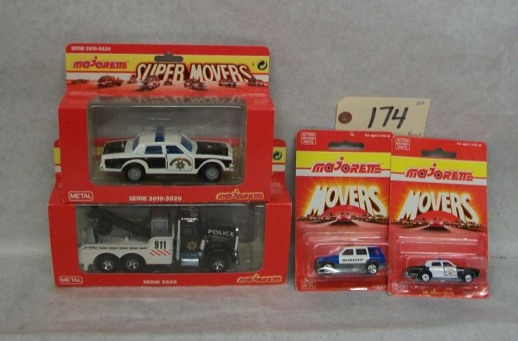 All vehicles in original packages Majorette Movers - 200 Series 1) 285 Cherokee Sheriff (blue and white) with action moving parts 2) 240 Impala Police (black and white) with 1) Highway patrol car (black and white) with action moving parts- 3008