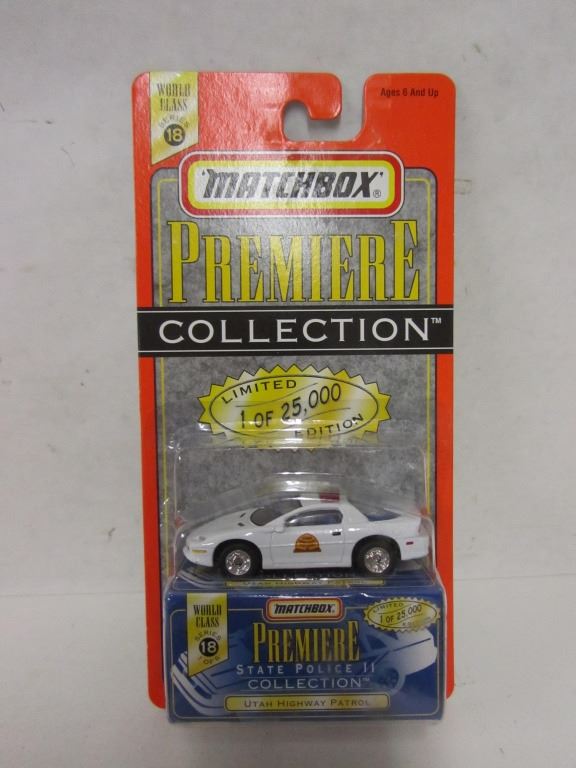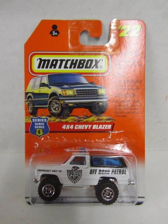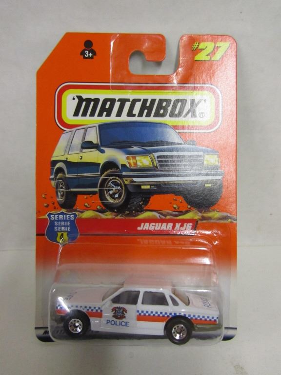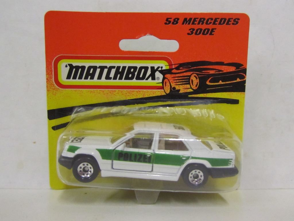 One Matchbox Series 4 Jaguar XJ6 die cast Police car in unopened package, One Matchbox Series 4 4X4 Chevy Blazer die cast Police truck in unopened package, One Matchbox '58 Mecedes 300E "Polezei" car in unopened