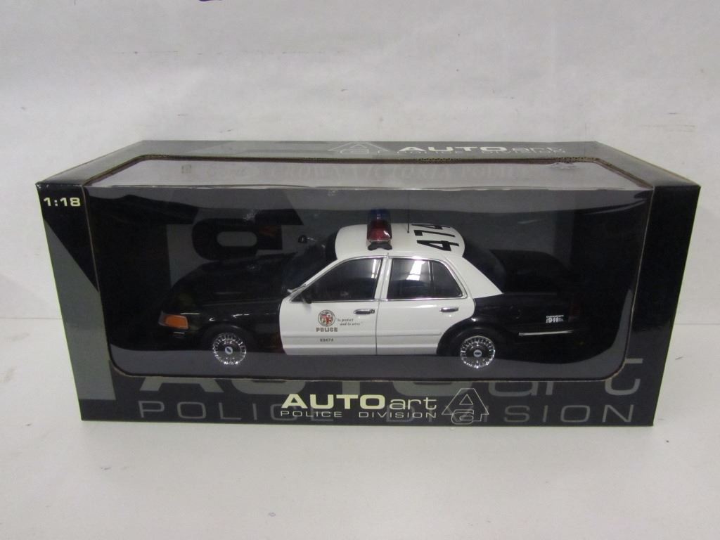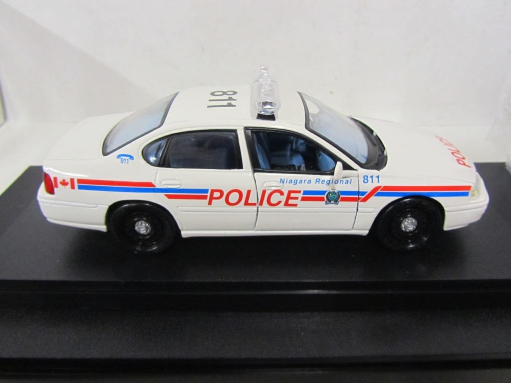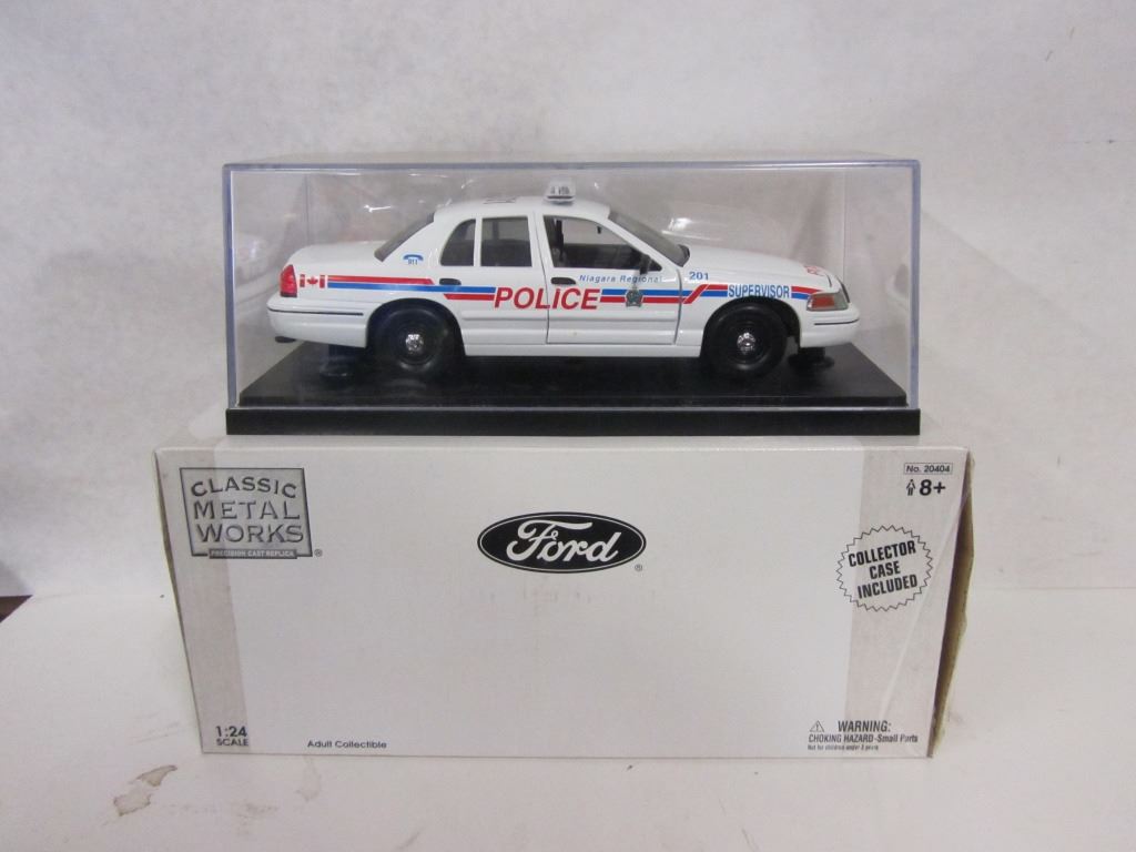 One One Niagra regional Police die cast car in display case box, One Auto Art Model die cast Crown Victoria Los Angelas Police car in original box, One Classic Metal Works die cast Niagra Regional Police Ford Police