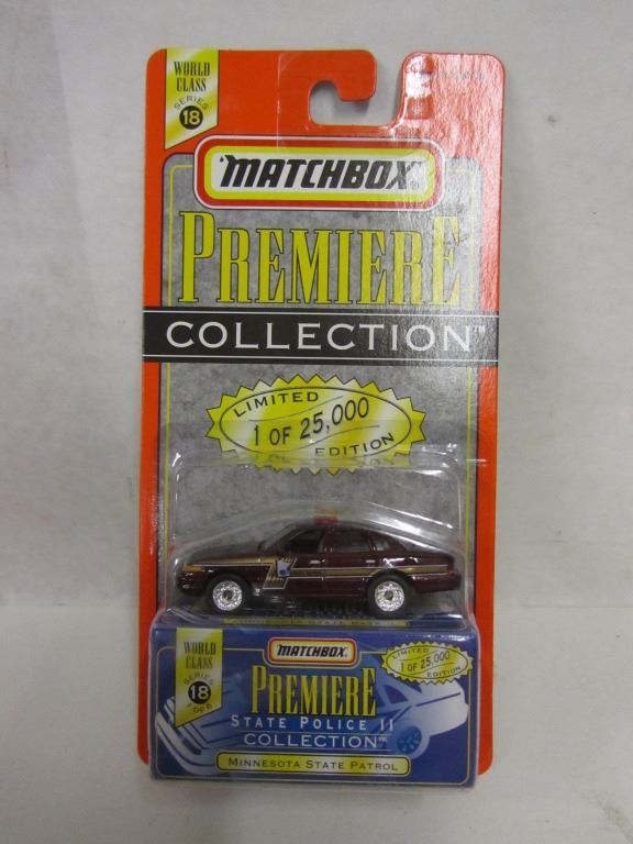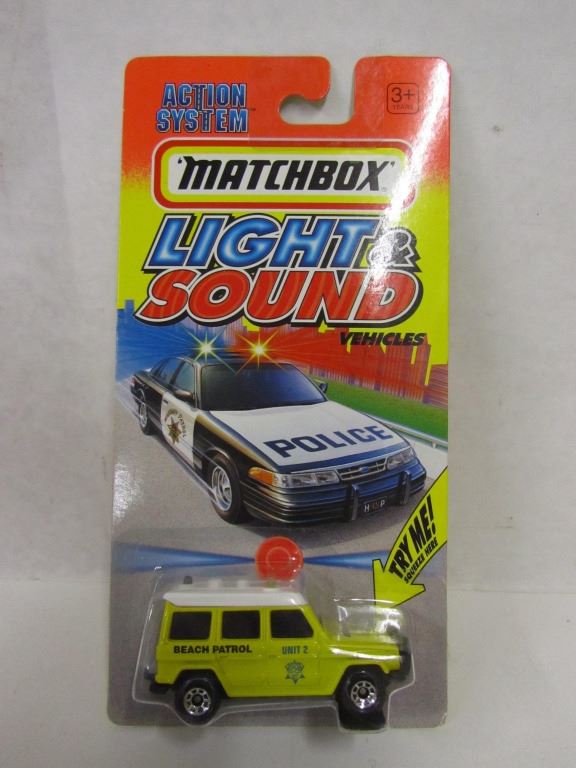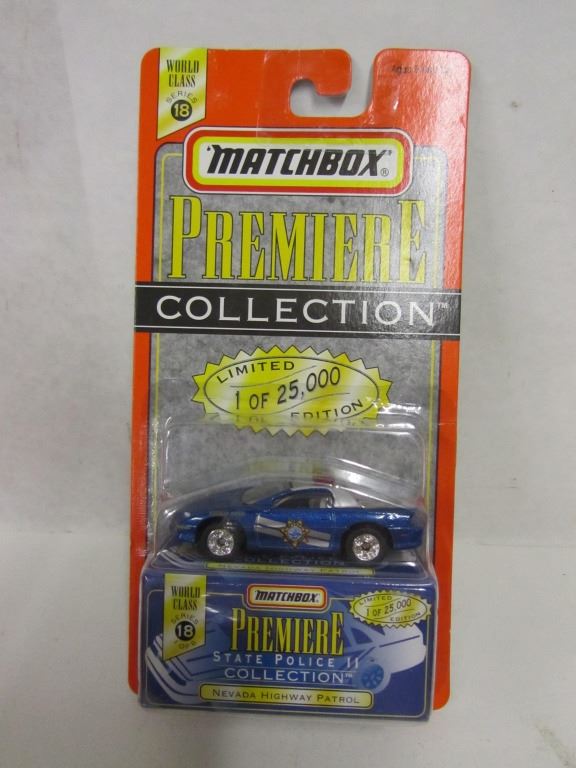 One Matchbox Light & Sound Vehicles Beach Patrol Mercedes SUV in unopened package, One Matchbox Premier Collection Limited Edition 1 of 25,000 die cast Nevada Highway Patrol State Police car in unopened package, One