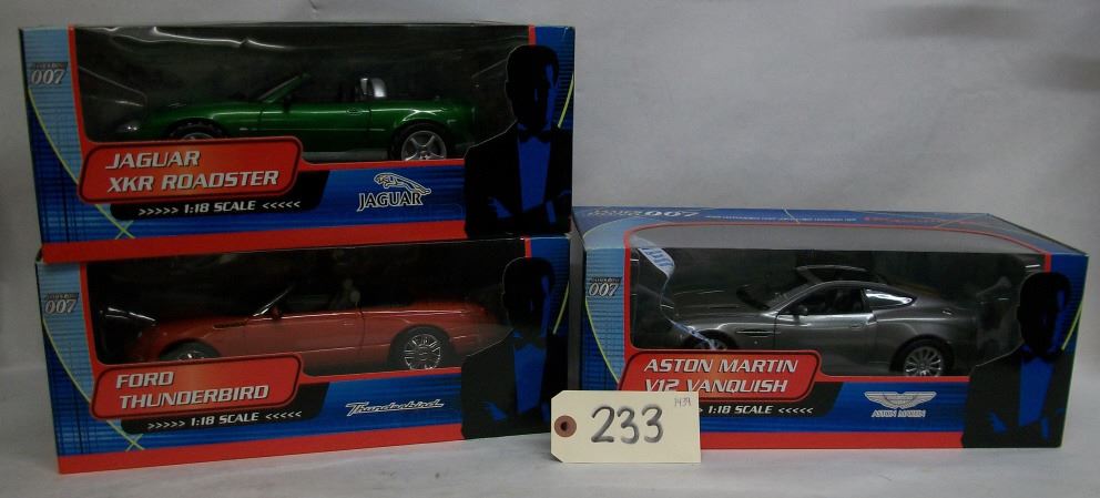 James Bond 40th Anniversary Die Cast Cars (The Beanstalk Group) 1:18 Scale, all in original packaging 1) Aston Martin V12 Vanquish- silver (As driven by James Bond in Die Another Day)-doors, hood and trunk, working steering, independent suspension, working ejector seat) 3) Jaguar XKR Roadster- green (As driven by Zao in Die Another Day- Otem 1002 (opening doors, hood and trunk, working steering,