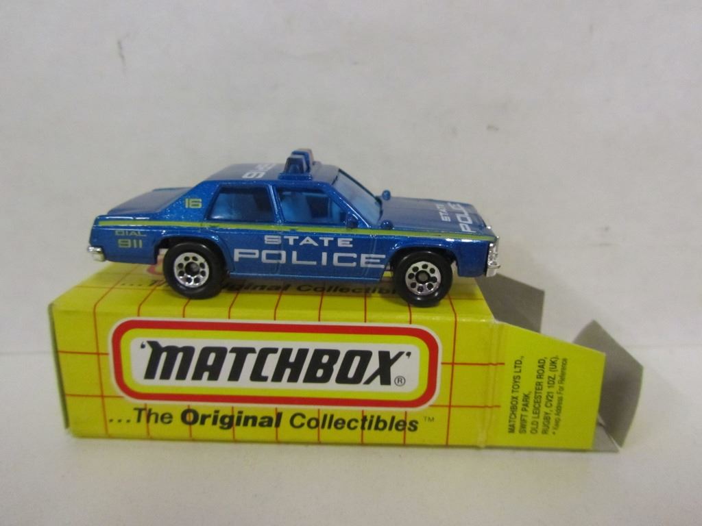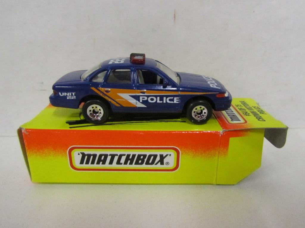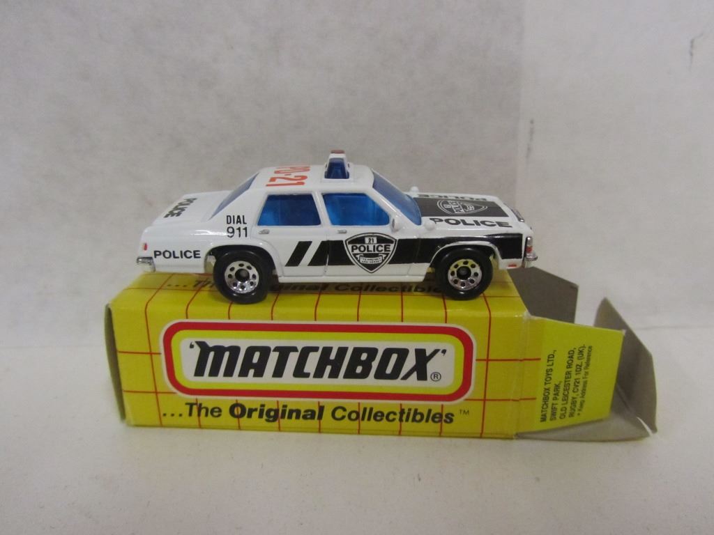 One Matchbox MB 16 die cast Ford Police Car (black and white) in original package, One Matchbox MB 16 die cast Ford Police Car (blue) in original package, One Matchbox Limited Edition #54 of 75 die cast Crown