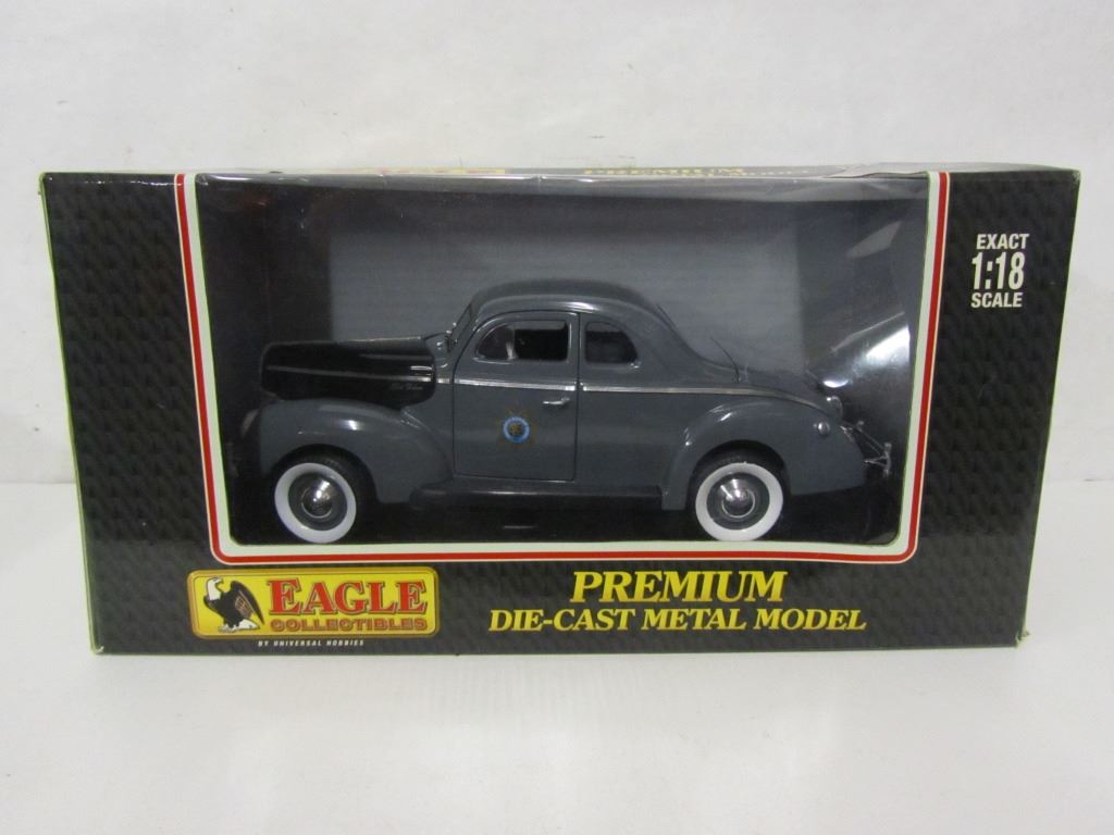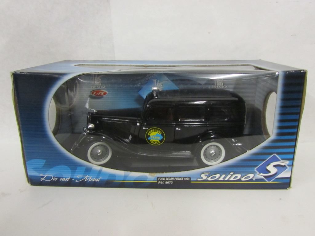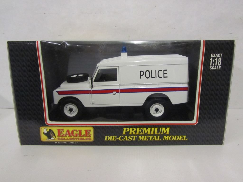 One Solido 1:18 scale die cast 1934 Kentucky State Ford Police Sedan in original packaging, One Eagle Collectibles 1:18 sclae die cast Land Rover Series III Police Patrol car in original packaging, One Eagle