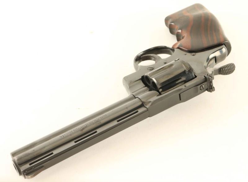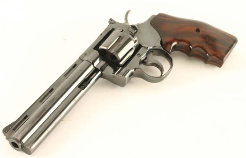 Desirable double-action revolver chambered in .357 Magnum, manufactured circa 1976. Features a high polish blued finish, 6" vent rib barrel with full underlug, raised ramp front sight, adjustable rear sight, fluted six-shot cylinder, serrated trigger, checkered wide hammer spur, serrated backstrap, and custom two-piece smooth finger groove wood grips. Revolver retains approximately 85% of it's original blued finish showing holster wear, and some scattered light surface & pin prick pitting. Action needs work as the cylinder is very tight with a heavy trigger pull, bore is pristine, and the wood grips are very good. Condition is NRA Good++. ***Modern Firearm***