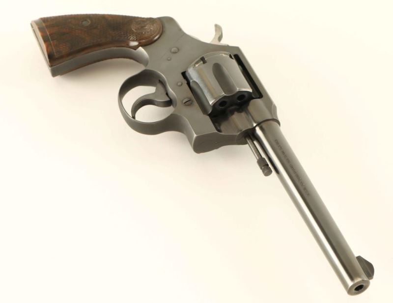 Vintage medium frame double action revolver chambered in .22 Long Rifle, manufactured circa 1954. Features a blued finish, 6" tapered barrel, blade front sight, square notched rear sight, fluted six shot cylinder with recessed chambers, non-shrouded ejector rod, serrated trigger, serrated hammer spur, square butt I frame and two-piece checkered Coltwood service grips with molded Colt medallions. Revolver exhibits approximately 95% of it's original finish with light edge wear, few handling marks and a single spot of dark rust observed on the right side of the frame near the hammer. Action is smooth with solid lock-up, the bore is pristine and the synthetic grips are fine. Condition is near NRA Very Good. ***C&R Firearm***
