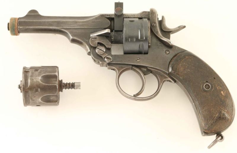 British military top-break double action revolver converted from .455 Webley to shoot .22 LR with a removable conversion kit. Features a blued finish, 4" bbl, standard fixed sights with an adjustable rear sight affixed to the barrel sleeve, non-fluted six shot .22 cylinder with automatic extractor, lanyard ring & two-piece checkered hard rubber grips. Stamped "ENGLAND" on the left side of the barrel. The serial numbers on the frame and barrel have been removed and the new serial number was added to the front strap. Includes a .455 cylinder(unnumbered) which has been shortened to 1.450" to accept .45 ACP in moon clips. With exception of the cylinder, the majority of the finish has turned to brown patina with approximately 15% bluing retained in the protected areas. The action performs well with very good lock-up, the bores on both the barrel & sleeve show scattered light pitting, the markings are very good and the grips are good with wear & small losses. Condition is NRA Good. ***C&R Firearm*** From The John F Sukey Collection