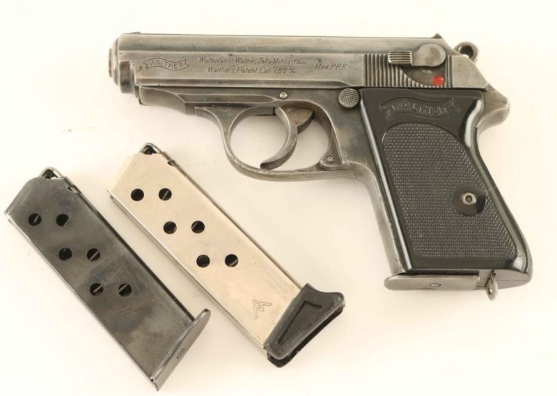 Early production German made double action semi-automatic pocket pistol chambered in 7.65mm, and manufactured at the Zella-Mehlis location. Features a blued finish, 3.35" barrel, fixed sights, smooth trigger, serrated round hammer spur, loaded chamber indicator, manual safety on the slide. push button magazine release, factory 7 round magazine steel frame with lanyard loop and two-piece checkered black plastic wrap-around grips. Includes two spare magazines. The pistol is predominantly in the-white and shows some bluing retained in the protected areas and light scattered pin prick pitting on the trigger guard, slide & frame. Action is sound, the bore is has good luster with some minor pin prick pitting, markings are good and the plastic grips are good with a crack in the left panel extending from the screw to the back of the grip. Condition is near NRA Good. ***C&R Firearm*** From The John F Sukey Collection
