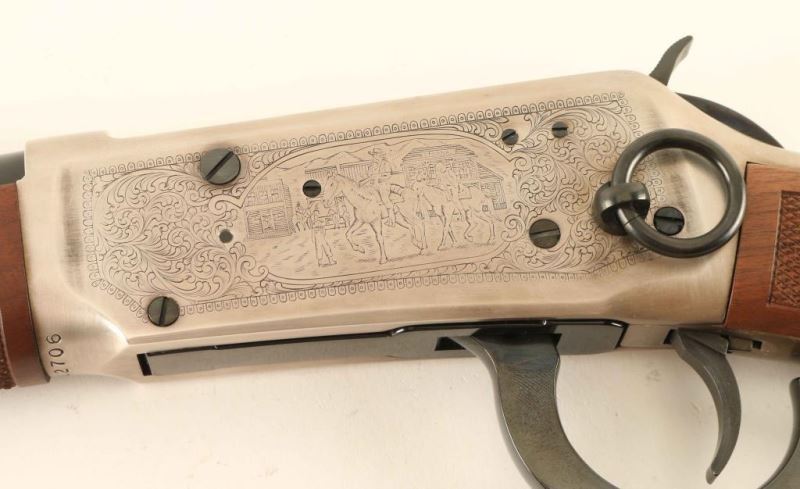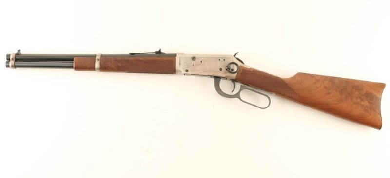 SN: LL12706 Commemorative lever action repeating rifle celebrating the Legendary Lawman of the American West. This rifle is one of only 19,999 produced, circa 1977. Features a blued 16" trapper length barrel, full-length magazine tube, two barrel bands, dovetailed patridge front sight, adjustable rear sporting sight, smooth trigger with beveled edges, serrated hammer spur, saddle ring, antique silver finished receiver with engraved lawman scenes & scroll border, checkered deluxe walnut forend and straight grip shoulder stock with metal carbine buttplate & inlayed lawman medallion on the right side. The receiver has provisions for a side mounted receiver sight. Includes the original factory styrofoam box with correct label, document, and sleeve. Rifle exhibits a few bright scuffs on the right side of the receiver near the top with no other observed wear. Action is crisp, the bore is pristine and the wood stocks are extra fine. Condition is NRA Excellent in box. ***C&R Firearm***
