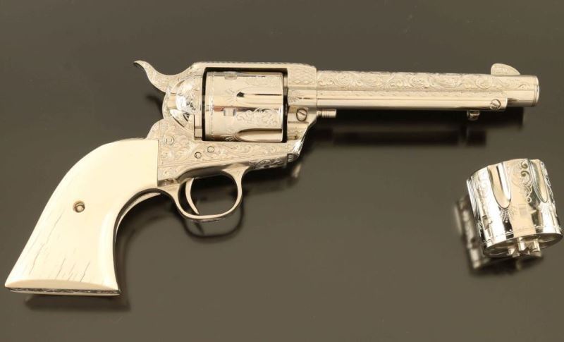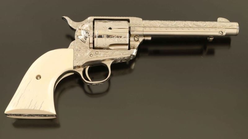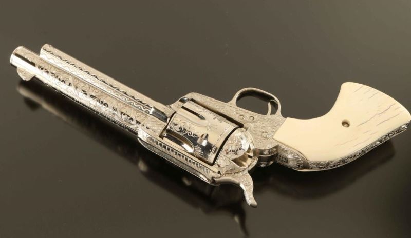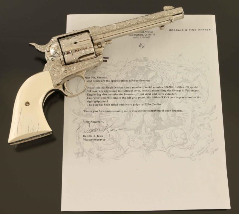 Sn: 356309 Masterfully engraved single action revolver chambered in .357 Magnum, with a .38 Special conversion cylinder. This revolver has been finely engraved by Colt factory engraver Dennis Kies, with 3/4 coverage in the style of Cuno Helfricht, loosely resembling the George S. Patton gun. Though numbered as a first generation gun, we believe this firearm to be a third generation revolver that has been renumbered. Features a bright nickel plated finish, marvelous 75% coverage engraving with floral scroll, punch dot & checker board designs, 5 1/2" barrel, blade front sight, square notched rear sight, ejector rod, fluted six-shot cylinder, smooth trigger, knurled hammer spur and smooth two-piece ivory grips with bark lines by Mike Poulin. Includes a letter from Dennis Kies detailing the work commissioned on the single action and a green velvet lined wood presentation case with spare cylinder & two six-round cartridge blocks. Revolver exhibits no visible wear. Action is crisp with good lock-up, the bore is pristine and the ivory grips are fine. Condition is NRA Perfect in case. ***Modern Firearm***