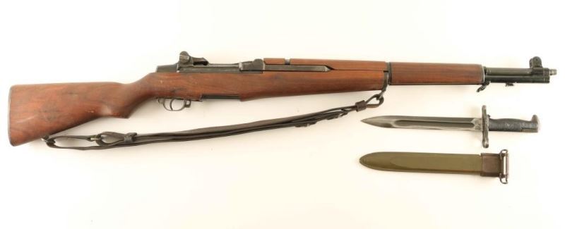 U.S. military contract clip fed semi-automatic service rifle chambered in .30-06 Springfield, manufactured circa 1942. Features a blued finish, 24" barrel marked "S-A-9-43," shrouded blade front sight, adjustable rear aperture sight, M1 bayonet with M7 scabbard, smooth trigger, manual safety in the front of the trigger guard, dark brown leather sling, "SA" marked bolt & trigger housing, smooth walnut handguard, pistol grip shoulder stock and checkered metal trapdoor buttplate with cleaning rod, oil and tool. Rifle retains approximately 70% of it's finish showing heavy wear on the action and little finish loss on the barrel & gas tube. Action is strong, the bore is very good+ and the wood stocks are very good. Condition is NRA Very Good. ***C&R Firearm*** From The John F Sukey Collection