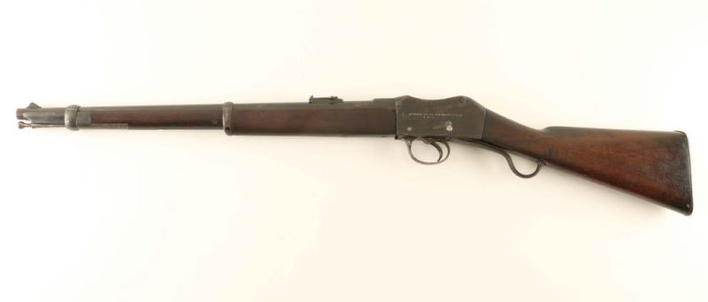 Modified British military lever-operated breech loading single shot service rifle chambered for the .577-450 Martini-Henry cartridge. Manufactured circa 1872. Converted from a Mark II rifle to Calvary Carbine configuration for the English NRA. Features a blued finish with a 21.25" barrel, military style front sight, tangent rear sight graduated to 10,000m, two barrel bands, metal end piece, cleaning rod, serrated trigger, cocked indicator, smooth wood forend and straight grip shoulder stock with metal buttplate. Marked 'Enfield/1872/II' on right side of receiver, 'Converted for the NRA by W.W. Greener/5365' on the left side of the barrel, "***" over the chamber on the barrel, and the stock is marked '2CL/607'. Barrel displays a mostly brown patina with some bright bluing retained in the protected areas and the receiver exhibits pinprick pitting throughout. Action is mechanically sound, bore is very good and the wood stocks are good with small losses. Condition is NRA Fair to Good ***Antique Firearm*** From The John F Sukey Collection