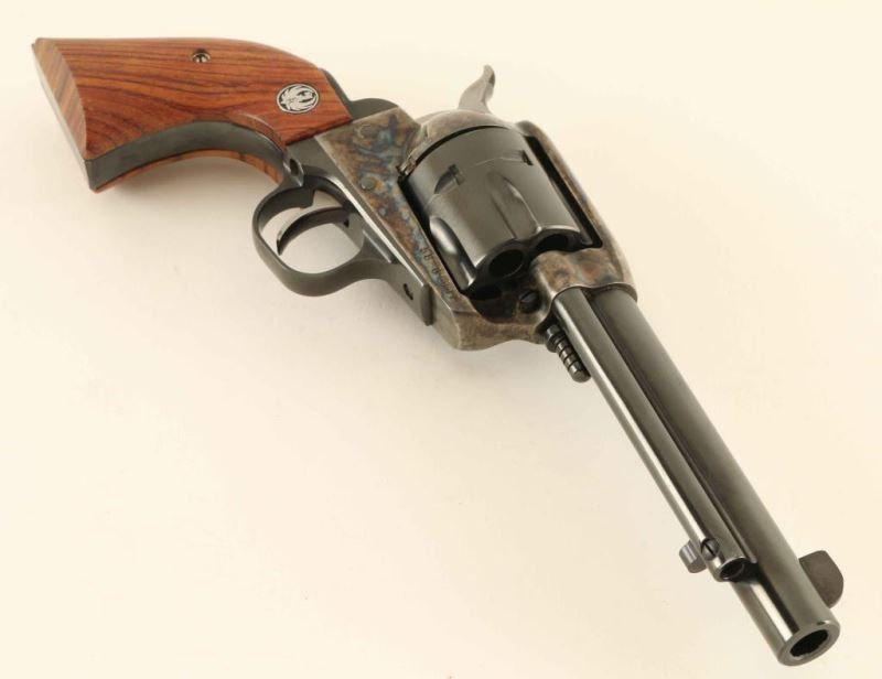 American made single action six-shot revolver chambered in .44 Magnum, manufactured circa 2004. Features a blued/case hardened finish, 5 1/2" barrel, blade front sight(which has been shortened slightly), square notched rear sight, ejector rod, fluted cylinder, smooth wide trigger, serrated hammer spur, transfer bar safety, and two-piece smooth wood grips with Ruger medallions. Includes the original factory hard case with documents and lock. Revolver exhibits approximately 90% of it's original finish showing a drag line on the cylinder and scattered losses on the frame. Action is smooth with good lockup, the bore is pristine, and the wood grips are fine. Condition is NRA Very Good. ***Modern Firearm***