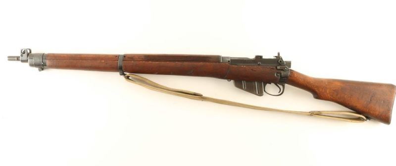 British military magazine fed bolt action service rifle chambered in .303 British, manufactured circa 1942. Features a blued finish, 25.2" barrel with integral bayonet lugs, shrouded patridge front sight, flip-up dual aperture rear sight mounted on the receiver, two barrel bands, smooth trigger, detachable 10 round magazine, manual safety on the left side of the receiver, tan canvas sling, integral charge loading guide cuts in the receiver, grooved full-length wood handguard, smooth forend, straight grip shoulder stock and metal trapdoor buttplate with oiler. The left side of the butt socket is marked "R O F/42/P25372/A." The receiver is stamped "No.4 Mk.1." Serial numbers match on the receiver and bolt handle. Rifle retains approximately 70% of it's bright blued finish showing moderate wear and a small amount of rust on the receiver. Action is smooth, the bore is excellent and the wood stocks are good with small scattered gouges. Condition is NRA Good. ***C&R Firearm*** From The John F Sukey Collection