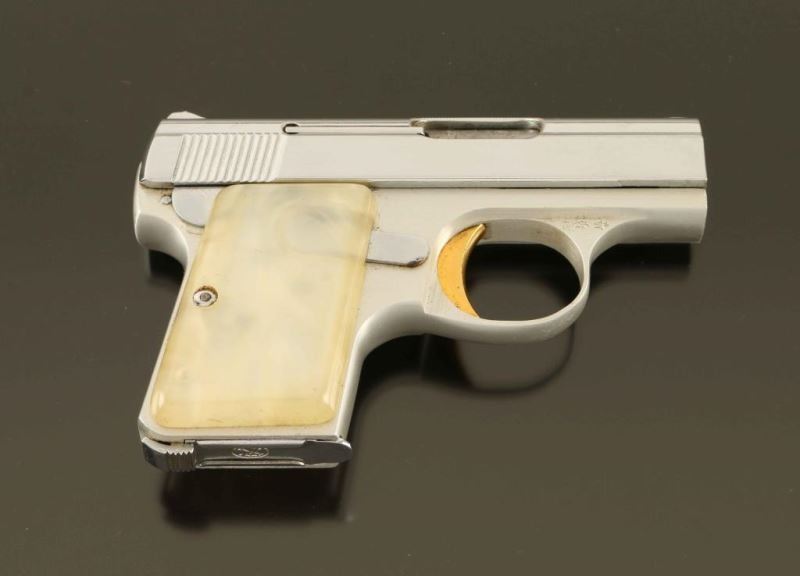 Belgium made striker fired semi-automatic pocket pistol chambered in 6.35mm, manufactured circa 1967. Features a nickel plated slide with serrated top rib, 2" barrel, full-length steel guide rod, fixed sights, smooth gold trigger, manual safety on the left side of the frame, heel magazine release, FN 6 round magazine, satin sliver finished alloy frame and two-piece translucent faux mother-of-pearl grips. Pistol retains nearly all of it's original finish showing moderated handling wear/scratches. Acton is smooth, the bore is pristine and the synthetic grips are very good.