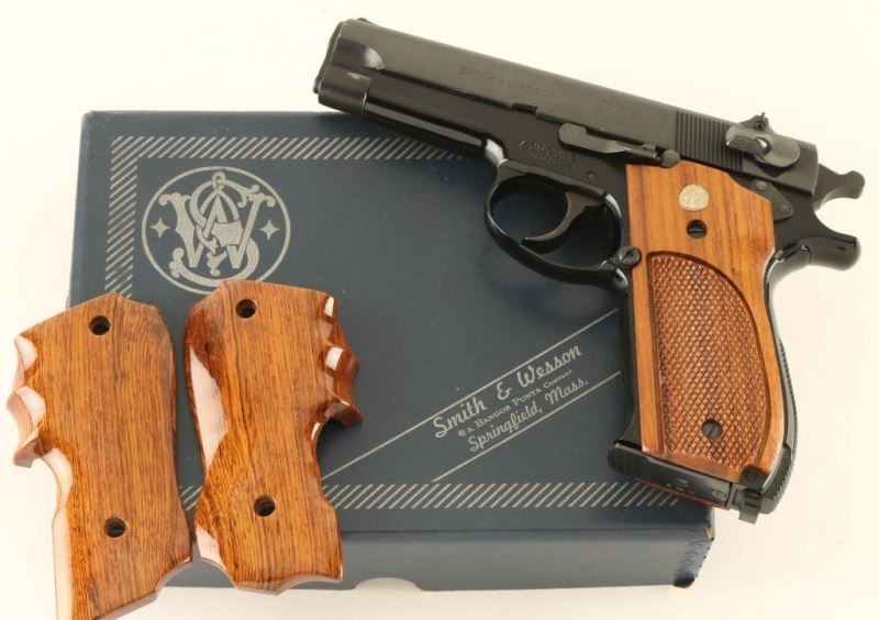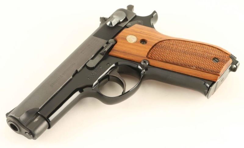 American made double action semi-automatic pistol chambered in 9x19mm, manufactured circa 1976. The model 39 with the first double action semi-automatic 9mm pistol manufactured in United States. Features a blued carbon steel slide, 4" barrel, full-length steel guide rod, ramp front sight, windage adjustable micrometer click rear sight, smooth trigger, serrated round hammer spur, long thumb safety/decocking lever, magazine disconnect safety, push button magazine release, factory 8 round magazine, black finished alloy frame with internal slot for a barrel weight, knurled alloy backstrap w/ lanyard loop and two-piece checkered walnut grips w/ silver S&W medallions. Includes a factory two-piece blue cardboard box with force matched label, cleaning rod, brush and custom two-piece smooth wood wrap-around grips. Pistol retains approximately 98%+ of it's original finish showing little muzzle wear. Action is sooth, bore is pristine and wood grips are extra fine. Condition is NRA Excellent in box. ***Modern Firearm***