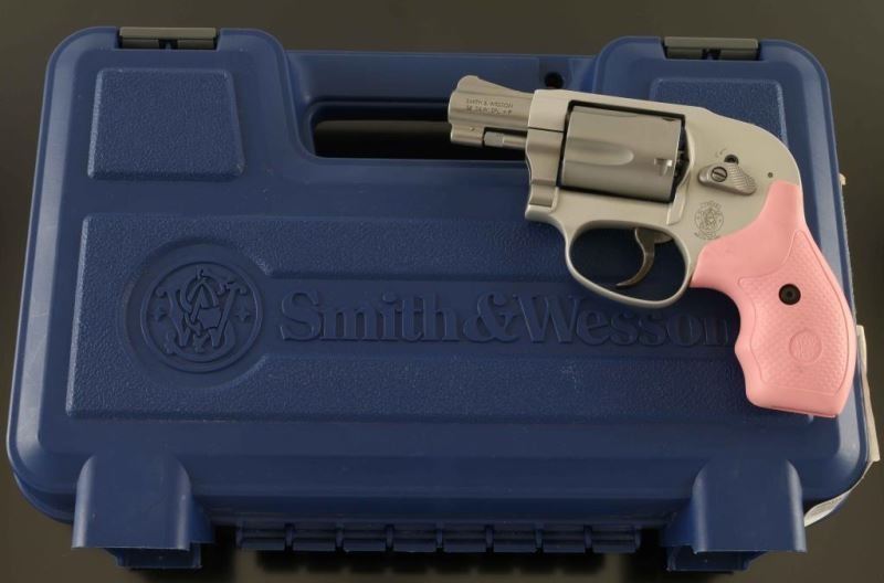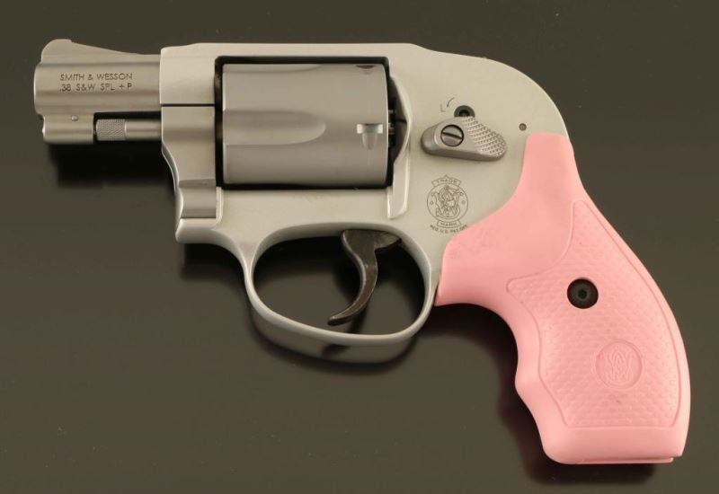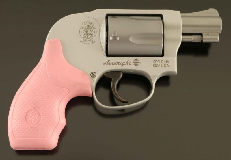'.38 Bodyguard Airweight Stainless' Lightweight small frame double action revolver chambered in .38 Special and rated for +P ammunition. Manufactured circa 2012. Features a matte finish, ribbed 1 7/8" stainless steel barrel, serrated ramp front sight, square notched rear sight, fluted five-shot stainless steel cylinder, non-shrouded ejector rod, MIM .312 " smooth combat trigger, shrouded hammer with serrated spur, internal key lock safety, three screw clear anodized round butt alloy J frame and two-piece textured pink rubber finger groove grips with S&W monograms. Includes the original factory hard case with manual, spent case, brush, keys and a set of black rubber grips. Revolver exhibits a thin drag line on the cylinder with a couple handling marks. Action is strong with very good lock up, the bore is excellent and the rubber grips are very good. Condition is NRA Excellent in case. ***Modern Firearm***