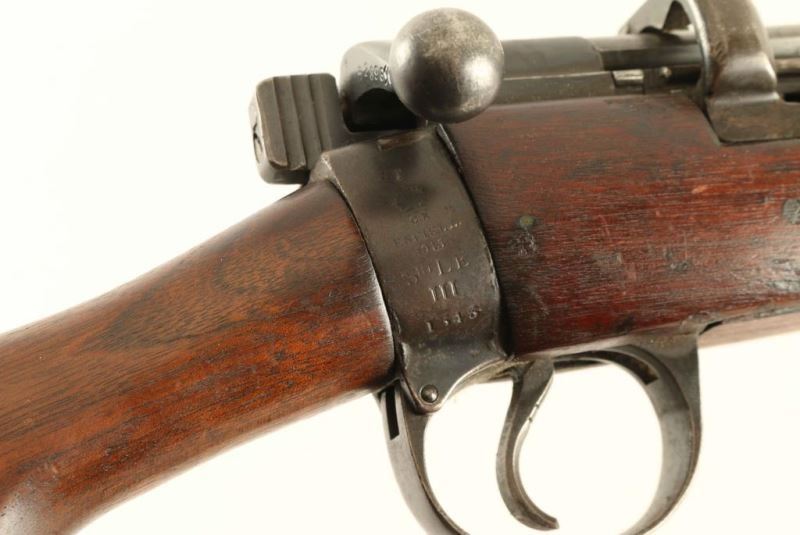Indian military bolt action single shot shotgun chambered for the .410 Mk 1Z cartridge. Rebuilt by R.F.I. utilizing an English made SMLE No 1 Mk III rifle. Features a blued finish, 25.2" barrel, raised patridge front sight, shrouded leaf type rear sight graduated to 2,000 yards, metal nosecap with bayonet lug & protective sight ears, single barrel band, serrated trigger, wood filled magazine well, manual safety on the left side of the receiver, green canvas sling, charge loading bridge on the receiver, full length smooth wood hand guard & forend, and straight grip shoulder stock with brass trapdoor buttplate containing an oiler. The right side of the butt socket is marked 'T/crown}/G.R./ENFIELD/1913" & "Sht L E/III/11545." The left side of the butt socket is market ".410 RFI/1929/A" Serial numbers match on the receiver, rear sight and nose cap. Rifle exhibits approximately 60% of its thinned blued finish with grey/brown patina making up the balance. Action is smooth, the bore is mirror bright and the wood stocks are good with repairs & blemishes. Condition is NRA Good ***C&R Firearm*** From The John F Sukey Collection