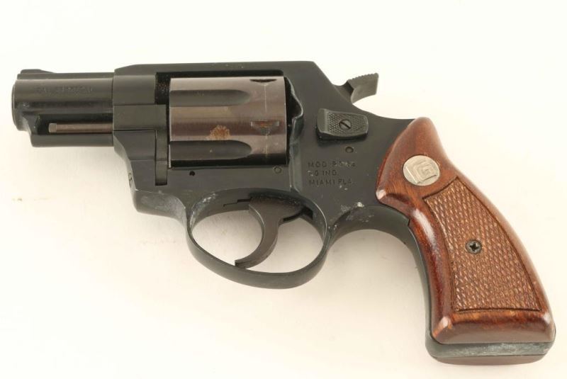 American made medium frame double action snub nosed revolver chambered in 38 Special. Features a black/blued finish with a 2 1/4" barrel, ramped front sight, square notched rear sight, smooth trigger, serrated wide hammer spur, shrouded ejector rod, fluted 6 shot cylinder, alloy frame and two piece checkered wood grips with 'RG' medallions. Pistol exhibits approximately 70% of its original finish showing some light rust on the cylinder. Action does not function properly as there is a timing issue, bore is pristine and wood grips are very good. Condition is NRA Fair ***Modern Firearm***