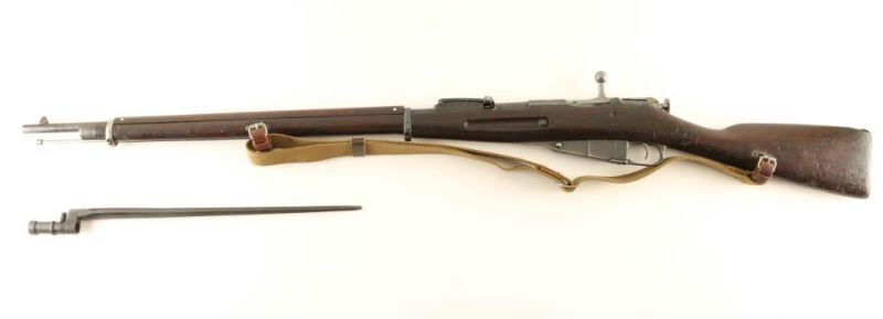 SN: 43644 Finnish military magazine-fed bolt action service rifle chambered in 7.62x54Rmm, produced in the United States circa 1915. Imported by C.A.I. of St. Albans, V.T. with import marks on the barrel. Featured a blued finish, 31.6" barrel, cruciform bayonet, dovetailed blade front sight, flip-up ladder style rear sight graduated to 3,200 meters, cleaning rod, 5 round internal box magazine, hex receiver, straight bolt handle, two barrel bands, tan canvas sling, smooth wood handguard and full-length straight grip shoulder stock with finger groove forend & smooth metal buttplate. The barrel is stamped with "SA" and "D" over the chamber. Serial numbers match on the receiver, barrel and bolt. Rifle retains approximately 30% of it's blued finish showing heavy wear, light scattered surface rust and pitting on the magazine. Action is smooth, the bore is very good and wood stocks are good. Condition is near NRA Good. ***C&R Firearm*** From The John F Sukey Collection