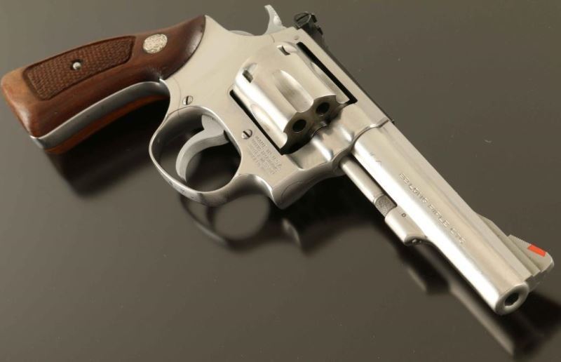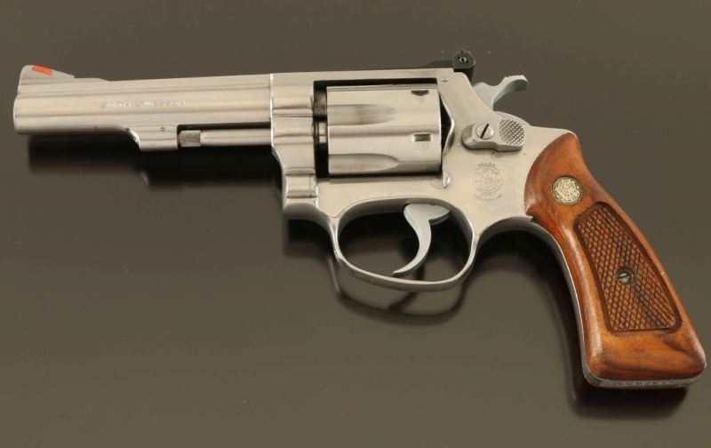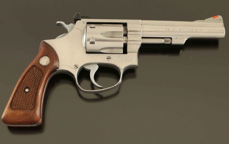 "1977 .22/.32 Kit Gun Stainless' Stainless steel small frame double action revolver chambered in .22 Long Rifle. Features a brushed finish, 4" barrel with partially serrated sighting rib, raised ramp front sight with red insert, adjustable micrometer click rear sight, fluted six-shot cylinder with recessed chambers, non-shrouded ejector rod, smooth .240 " trigger, .375" semi-target hammer, three screw round butt J frame and two-piece checkered walnut Magna grips with silver S&W medallions. Revolver exhibits a moderate to heavy amount of handling marks. Action is smooth with very good lock up, the bore is excellent and the matching wood grips are good+ with a small chip in the left panel. Condition is NRA Good+++ ***Modern Firearm***