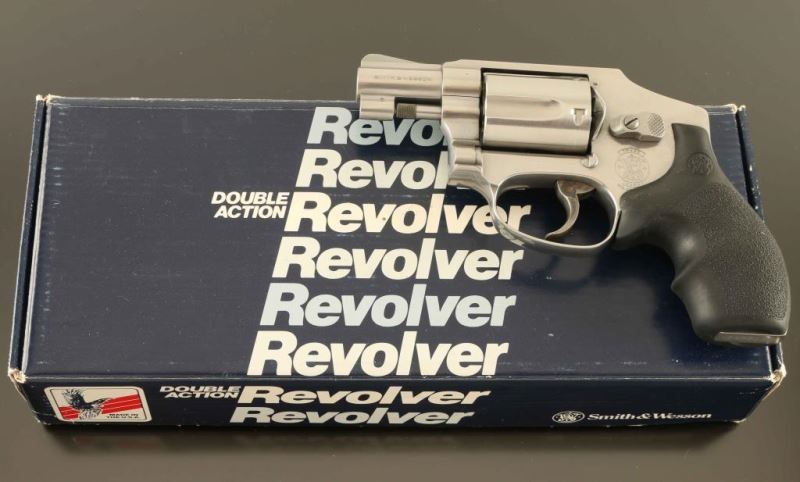 '.38 Centennial Stainless' Stainless steel small frame double-action-only concealed hammer revolver chambered in .38 Special, manufactured circa 1996. Features a polished finish, ribbed 2" barrel, serrated ramp front sight, square notched rear sight, fluted five-shot cylinder, non-shrouded ejector rod, .312" smooth combat trigger, concealed hammer, three screw round butt J frame and one-piece Hogue pebbled black rubber grip with S&W insignias. Includes a factory one-piece blue cardboard box with paper. Revolver exhibits a bright drag line on the cylinder and moderate handling wear. Action is strong with tight lock-up, bore is pristine and rubber grips are very good. Condition is NRA Very Good in box. ***Modern Firearm***
