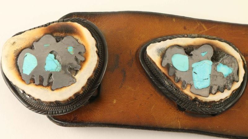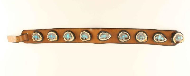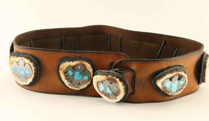 Smooth brown 3 1/8" wide leather band inlaid with eight elk horn conchos that are inlaid with sterling eagles with turquoise stone accents. Matching belt buckle. Waist size 30-34.