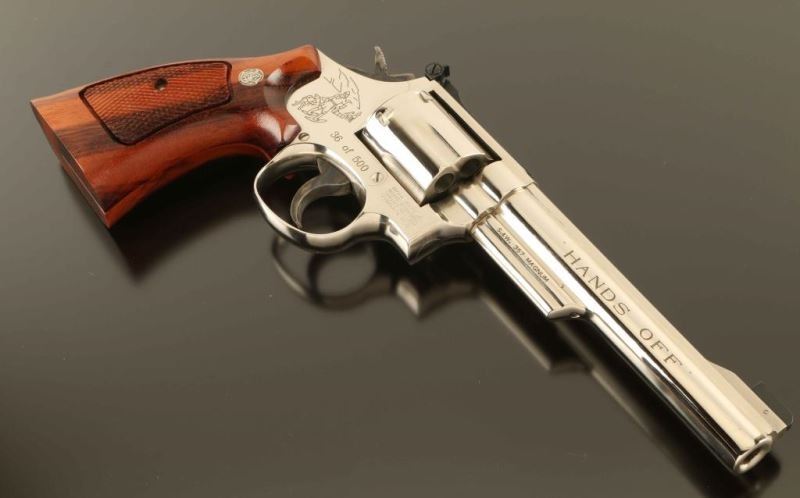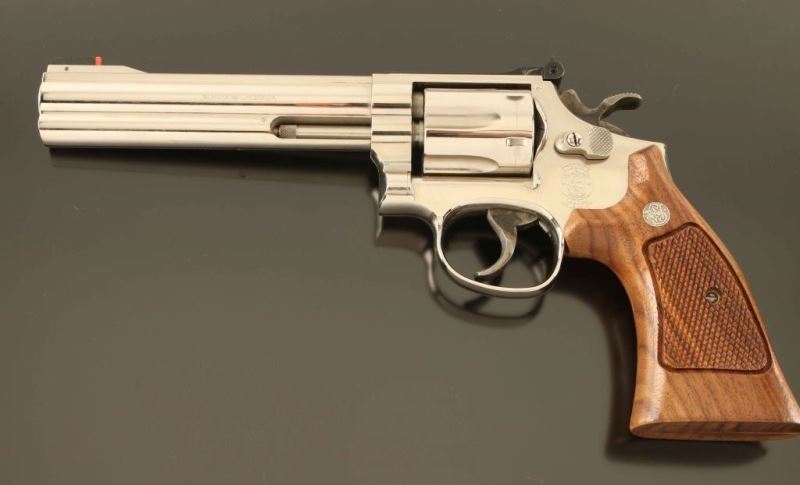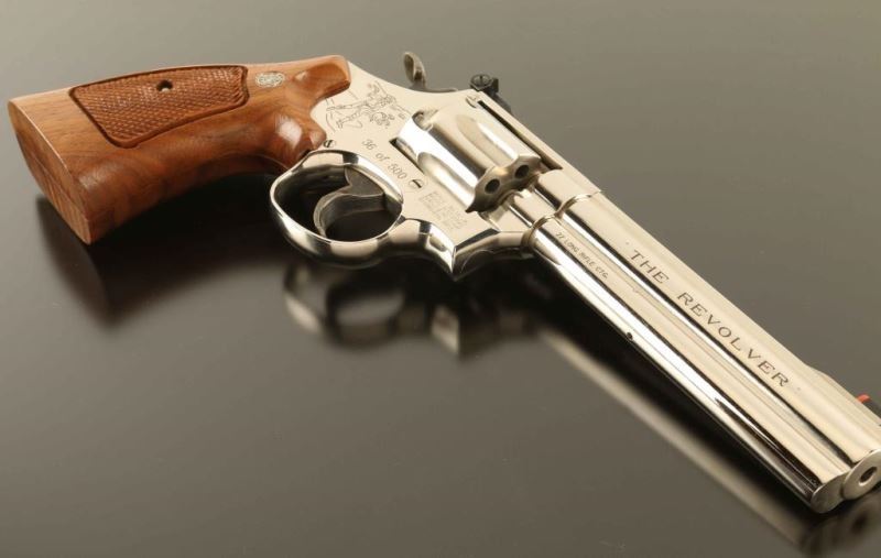 SN: BFH9878 #36 of 500 June edition of the "Twelve Revolvers", a limited edition Ellett Brothers exclusive where a new revolver was released each month for the year of 1990 with an action scene & title inspired by early S&W advertisers. 'The K-22 Masterpiece' Medium frame double-action revolver chambered in .22 Long Rifle, manufactured circa 1990. Features a nickel plated finish, ribbed 6" barrel with full underlug, raised patridge front sight with orange bead, adjusted micrometer click rear sight, fluted six-shot cylinder with counterbored chambers, serrated .400" target trigger, .500" target hammer, three screw square butt K target frame and two-piece checkered Walnut target grips with silver S&W medallions. Includes the original factory two-piece blued cardboard box with tool, documents, parchment paper, cleaning tools and matching label. The revolver exhibits nearly all of it's original finish showing only a few minor handling marks and a very faint drag line on the cylinder. Action is smooth with tight lock up, the bore is pristine and the wood grips are extra fine. Condition is near NRA Perfect in box. ***Modern Firearm****