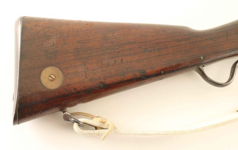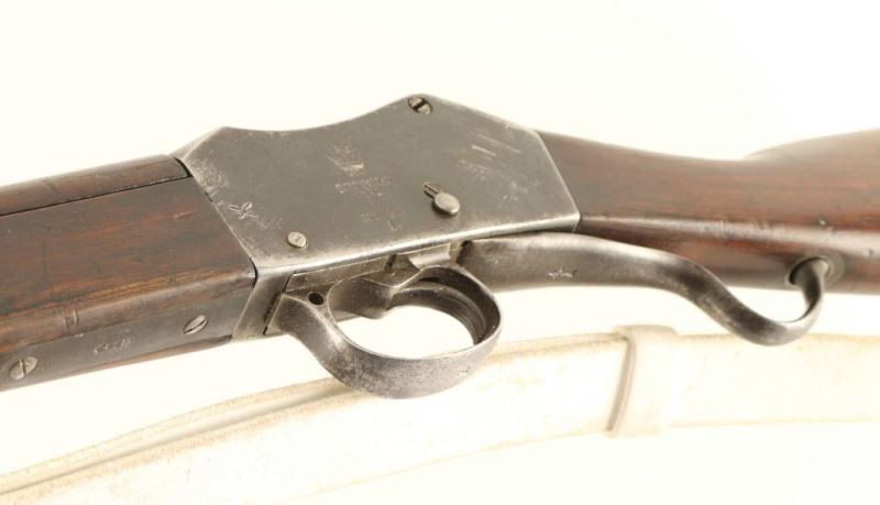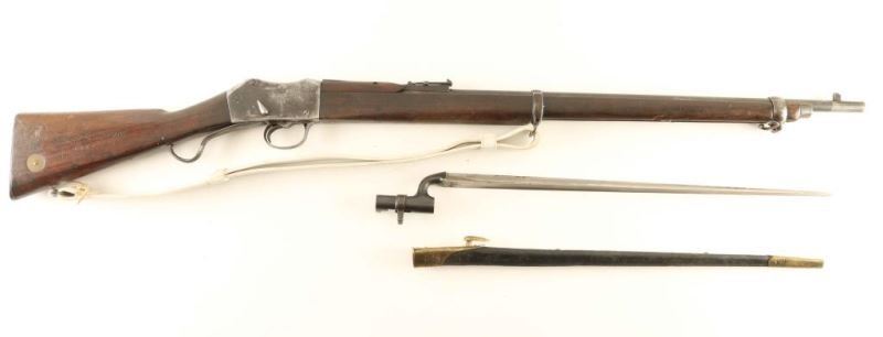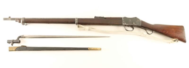 Converted British military lever-operated breech loading single shot service rifle chambered for the .303 British, manufactured circa 1878 with an 1896 dated conversion. Features a blued finish with a 30 1/4" barrel, raised blade front sight, graduated rear sight, two barrel bands, metal forend cap, serrated trigger, short lever, cocked indicator, smooth wood handguard full length forend, and straight grip shoulder stock with brass disc and metal buttplate. Includes a bayonet and scabbard. Marked '[crown]/VR, Enfield/1879, III/1/2' on the right side of the receiver, [crown]/VR, Enfield/1896, and M.E.303/I. on the left side of the receiver. 'VIC-COB inside a circle, Enfield circular cartouche/I/1 and 1005' on the stock. Rifle exhibits approximately 20% of its thin blue finish overall showing scattered pinprick pitting. The action functions well, bore is dark with good rifling and the wood stock is good with blemishes and a 2" splinter along side the cleaning rod channel. Condition is NRA Fair to Good ***Antique Firearm*** From The John F Sukey Collection