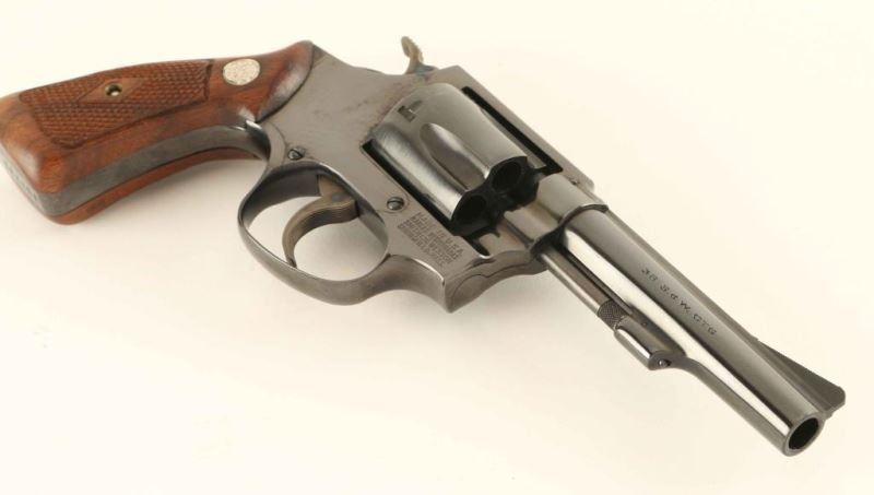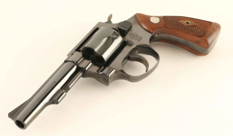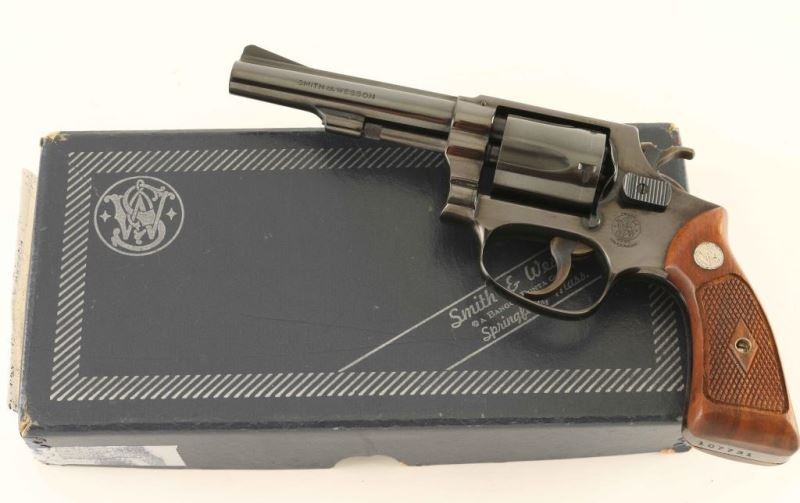 '38 Regulation Police' Small frame double action revolver chambered in 38 Smith & Wesson, manufactured circa 1965. Features a blued finish, pinned 4" barrel with matted sighting rib, serrated ramp front sight, square notched rear sight, non-shrouded ejector rod, fluted five-shot cylinder, serrated .240" trigger, .240" hammer, flat latched thumb piece, three screw round butt J frame and two-piece diamond checkered walnut Magna grips with silver S&W medallions. Includes a factory two piece blue cardboard box with a reprinted label. The revolver retains approximately 98% of it's original blued finish showing a faint drag line on the cylinder and some bright wear along the edge of the side plate. Action is smooth with very good lock up, the bore is pristine and the matching wood grips are fine. Condition is NRA Excellent in box. ***C&R Firearm****