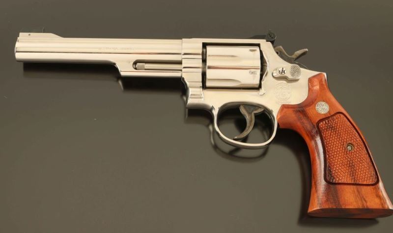 SN: BFT5287 #36 of 500 December edition of the "Twelve Revolvers" - a limited edition Ellett Brothers exclusive where a new revolver was released each month for the year of 1990 with an action scene & title inspired by early S&W advertisers. 'The .357 Combat Magnum' Medium frame double-action revolver chambered in .357 Magnum, manufactured circa 1990. Features a nickel plated finish, 6" barrel with partially serrated wide sighting rib, raised patridge front sight, adjusted micrometer click rear sight, shrouded ejector rod, fluted six-shot cylinder, serrated .265" service trigger, .375" semi-target hammer, three screw square butt K target frame and two-piece checkered Goncalo Alves target grips with silver S&W medallions. Includes the original factory two-piece blued cardboard box with tool, documents, parchment paper, cleaning tools and matching label. The revolver exhibits nearly all of it's original finish showing only a few minor handling marks and a very faint drag line on the cylinder. Action is smooth with very good lock-up, the bore is pristine and the wood grips are extra fine. Condition is near NRA Perfect in box. ***Modern Firearm****