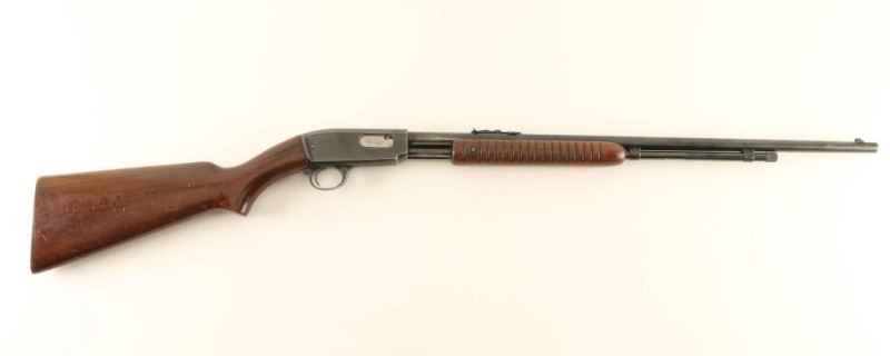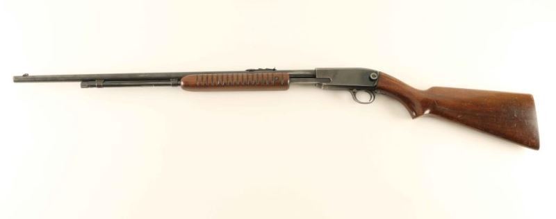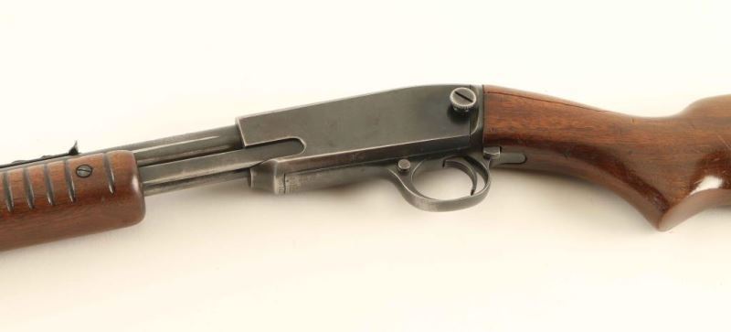 Pump action 22 with a blued finish and 24" barrel. 10Rd under barrel tubular magazine. Cracks in stock on left and right side behind receiver. Missing buttplate. NRA Poor to Good ***Modern Firearm***