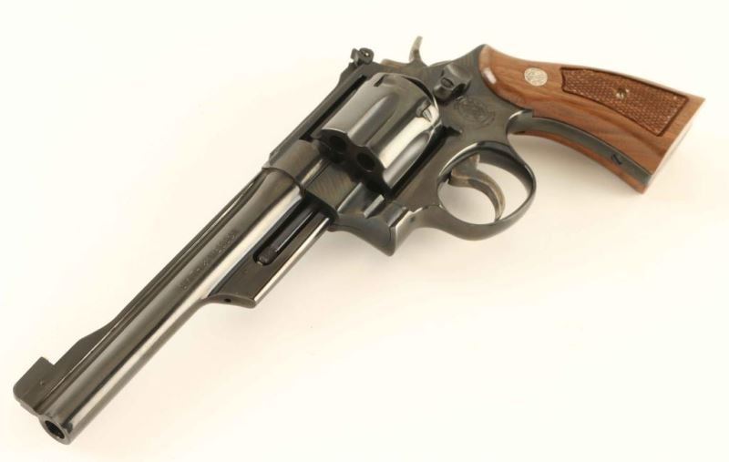 SN: BFM5190 #36 of 500 September edition of the "Twelve Revolvers" - a limited edition Ellett Brothers exclusive where a new revolver was released each month for the year of 1990 with an action scene & title inspired by early S&W advertisers. 'The .357 Magnum' Large frame double-action revolver chambered in .357 Magnum, manufactured circa 1990. Features a blued finish, 6 1/2" barrel with knurled sighting rib, raised patridge front sight with gold bead, adjusted micrometer click rear sight, shrouded ejector rod, fluted six-shot cylinder with counterbored chambers, serrated .265" service trigger, .375" semi-target hammer, three screw square butt N target frame with knurled top strap and two-piece checkered walnut Magna grips with silver S&W medallions. Includes the original factory two-piece blued cardboard box with tool, documents, parchment paper, cleaning tools and matching label. The revolver exhibits nearly all of it's original finish showing a light drag line on the cylinder with no other observed wear. Action is smooth with solid lock-up, the bore is pristine and the wood grips are extra fine. Condition is near NRA Perfect in box. ***Modern Firearm****