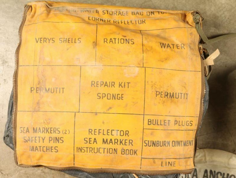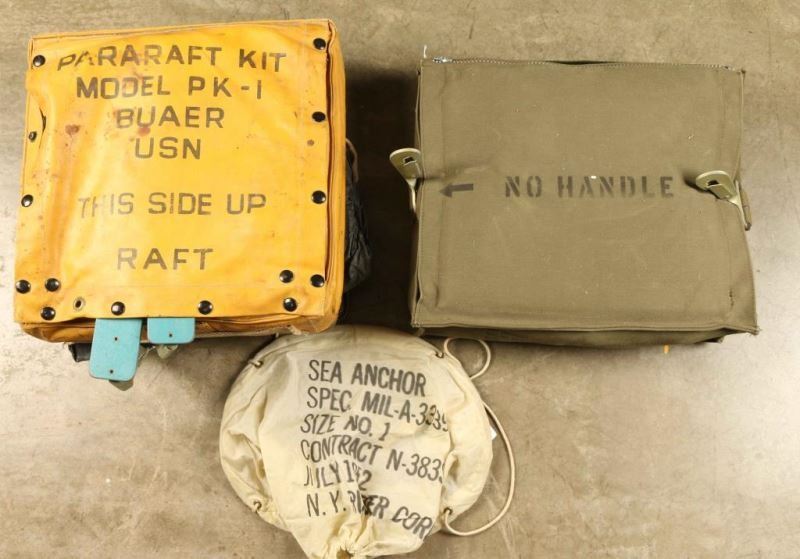 Including; Sea Anchor Spec. Mil-A-3339 July 1952, OD Green Pnuematic Life Raft 1952, and a Life Raft Kit-Pararaft Kit Model PK-1 Buaer USN with oars, rations, sea markers, safety pins, matches and more.
