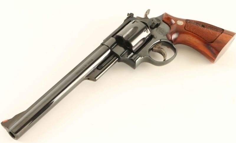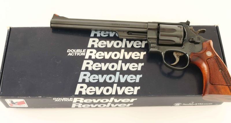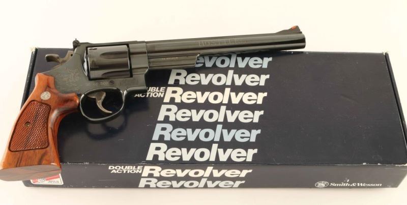 SN: BER1886 #36 of 500 January edition of the "Twelve Revolvers" - A limited edition Ellett Brothers exclusive where a new revolver was released each month for the year of 1990 with an action scene & title inspired by early S&W advertisers. 'The .44 Magnum' Large frame double-action revolver chambered in .44 Magnum, manufactured circa 1990. Features a blued finish, 8 3/8" barrel with partially serrated wide sighting rib, raised ramp front sight with red insert, adjusted micrometer click rear sight with white outline, shrouded ejector rod, fluted six-shot cylinder, serrated .400" target trigger, .500" target hammer, three screw square butt N target frame and two-piece checkered Goncalo Alves target grips with silver S&W medallions. Includes the original factory one-piece blued cardboard box with tool, documents, parchment paper, cleaning tools and matching label. The revolver exhibits nearly all of it's original finish showing a light drag line on the cylinder with no other observed wear. Action is smooth with tight lock-up, the bore is pristine and the wood grips are extra fine. Condition is near NRA Perfect in box. ***Modern Firearm****