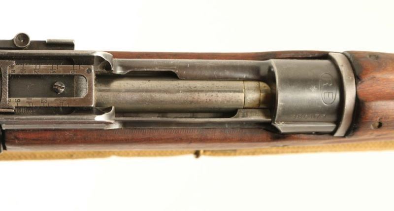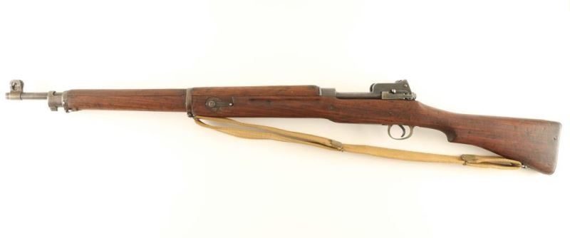 'No 3 Mk 1*r' British military magazine fed bolt action service rifle chambered in .303 British, manufactured in the United States circa 1914-1916. Imported by C.A.I. of St. Albans, V.T. with import marks on the underside of the barrel. Features a blued finish, 26" barrel, shrouded patridge front sight, receiver mounted flip-up latter style aperture sight graduated to 1,600 yards, volley sights, metal forend cap/barrel band with bayonet lug & piling swivel, serrated trigger, internal 6 round box magazine, manual safety on the right side of the receiver, bent bolt handle, charge loading guide cuts in the receiver, tan canvas sling smooth wood handguard, finger grooved forend and straight grip shoulder stock with brass disc & metal trapdoor buttplate. The stock is marked with a [broad arrow]/a circled"IR/1914" & "*." The bolt is marked with a "*" and the receiver is marked with a "RE" inside an oval/"*" & has various English proofs. The receiver & floorplate exhibits approximately approximately 70% of their thinned blued finish white the barrel, barrel bands & trigger guard have predominantly turned to brown patina. Action is smooth, the bore is dull with shallow rifling and the wood stocks are good to very good. Condition is NRA Good+. ***C&R Firearm*** From The John F Sukey Collection