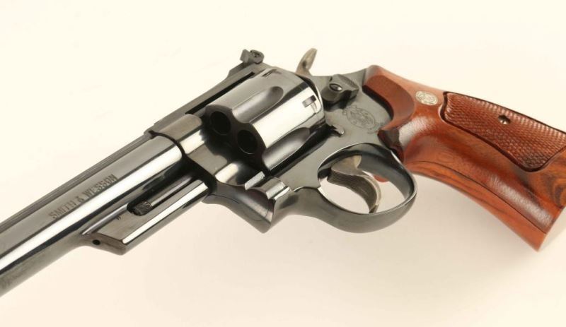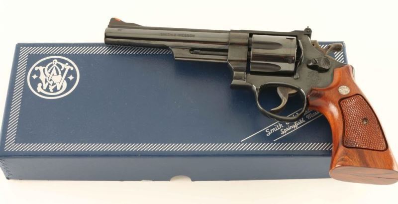 SN: BFA9968 #36 of 500 May edition of the "Twelve Revolvers" - A limited edition Ellett Brothers exclusive where a new revolver was released each month for the year of 1990 with an action scene & title inspired by early S&W advertisers. 'The .41 Magnum Target' Large frame double-action revolver chambered in .41 Magnum, manufactured circa 1990. Features a blued finish, 6" barrel with partially serrated wide sighting rib, raised ramp front sight with red insert, adjusted micrometer click rear sight with white outline, shrouded ejector rod, fluted six-shot cylinder, serrated .400" target trigger, .500" target hammer, three screw square butt N target frame and two-piece checkered Goncalo Alves target grips with silver S&W medallions. Includes the original factory two-piece blued cardboard box with tool, documents, parchment paper, cleaning tools and matching label. The revolver exhibits nearly all of it's original finish showing a light drag line on the cylinder with no other observed wear. Action is smooth with tight lock-up, the bore is pristine and the wood grips are extra fine. Condition is near NRA Perfect in box. ***Modern Firearm****