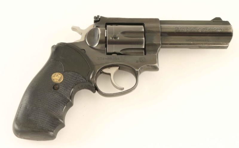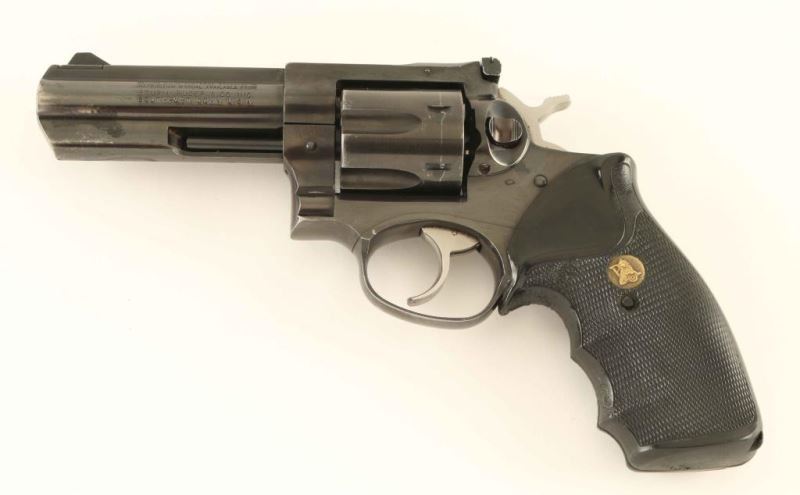 6 shot Blued revolver, pachmeyer black rubber grips, 4"BBL,bore is dark but good. Condition NRA Good Modern Firearm