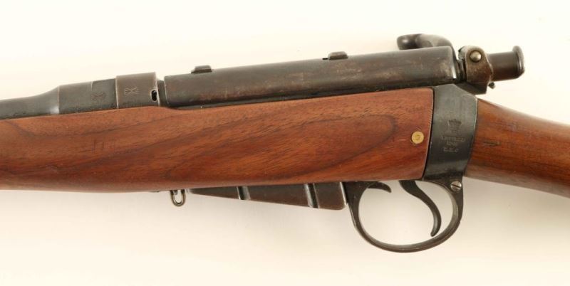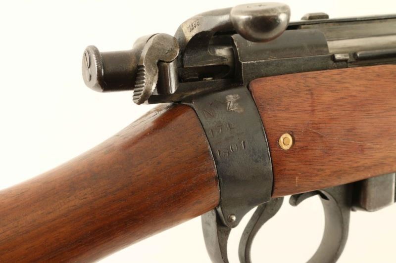 SN: 216 New Zealand marked British military magazine fed bolt action service rifle chambered in .303 British, that was downgraded to Drill Purpose. Features a blued finish, 20.75" barrel, blade front sight with protective wings, ladder style rear sight graduated to 2000 yards, metal forend cap with bayonet lug & slot for a cleaning rod, serrated trigger, detachable 5 round magazine linked to the bottom metal, magazine cut-off on the right side of the receiver, dust cover & manual safety on the bolt, smooth wood hand guard, full length forend and straight grip shoulder stock with metal disk & brass trapdoor buttplate. The left side of the butt socket is marked '[crown]/VR/ Enfield/1901/L.E.C" and the right side is marked "N[broad arrow]Z/174/1901." The stock disk is stamped "N[broad arrow]Z/19 19/1880" and barrel is stamped "E" & "DP" over the chamber. Serial numbers match on the receiver and barrel. Rifle retains approximately 60% of it;s blued finish with the balance turned to brown patina. Action is smooth, the bore is good and the wood stocks are fine. Condition is NRA Very Good ***Antique Firearm*** From The John F Sukey Collection