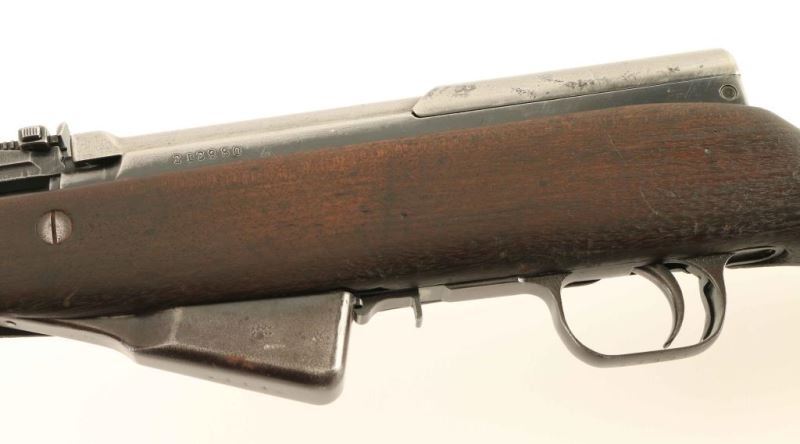Modified Chinese made semi automatic SKS patterned rifle chambered in 7.62x39. Imported by Navy Arms Company of Ridgefield, NJ with import marks on the right side of the receiver. Features a blued finish, cut down 16.5" barrel, adjustable hooded post front sight, leaf style rear sight graduated to 1000 m, fixed ten round box magazine, smooth trigger, manual safety on the right side of the trigger guard, smooth wood hand guard, and semi pistol grip shoulder stock with finger grooved forend. sling swivel and trapdoor metal buttplate containing a cleaning kit. Matching serial numbers on the receiver, bolt, top cover, stock, and magazine. Rifle exhibits a mostly browned patina showing some heavy wear and light pitting on the top cover and some bright bluing retained on the receiver along the stock line. Action is smooth, bore is pristine, and the wood stocks are near good with a large crack extending from the rear of the receiver to an inch above the trigger guard. NRA Near Good ***C&R Firearm***