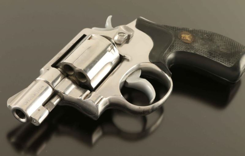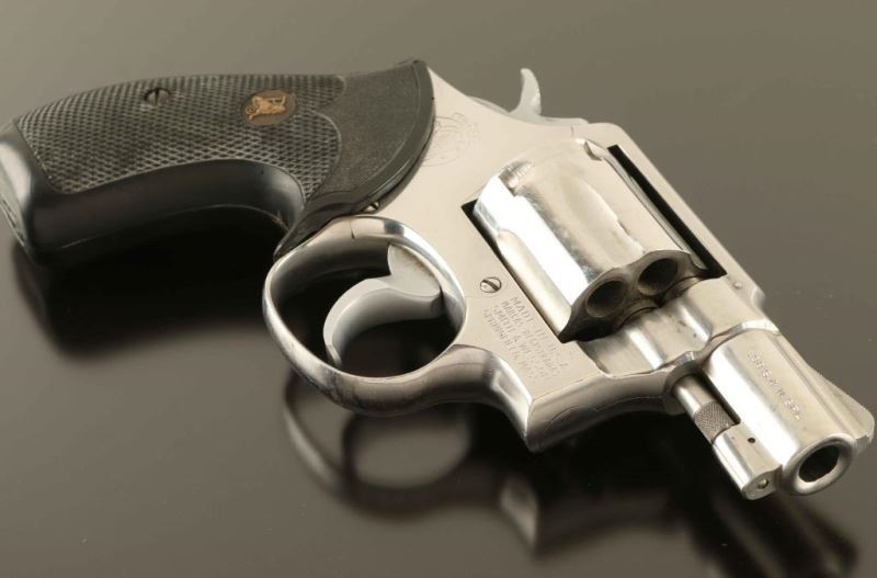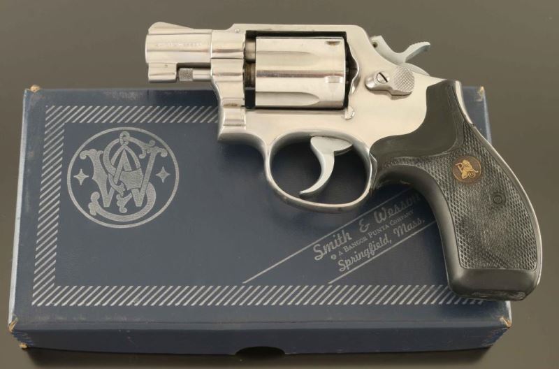 '.38 Military & Police Stainless' Medium frame stainless steel double-action revolver chambered in .38 Special, manufactured circa 1981. Features a polished finish, pinned 2" barrel with sighting rib, non-shrouded ejector rod, serrated ramp front sight, square notched rear sight, fluted six-shot cylinders, smooth .400" target trigger, .265" hammer, three screw round butt K service frame and one-piece Pachmyer Presentation/Compac checkered black rubber wrap-around grips. Includes a factory two-piece blue cardboard box with paper and forced matched label. Revolver has been brightly polished and shows moderate to heavy wear. Action is smooth with very good lock-up, bore is excellent, and the rubber grips are very good. Condition is NRA Good in box. ***Modern Firearm***