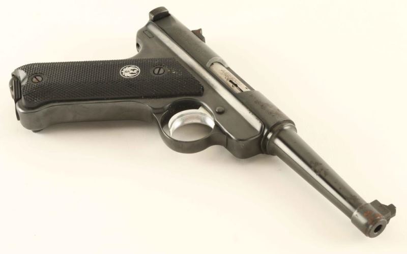 Semi-auto pistol with blued finish, 2 Factory Mags, standard configuration, bore is bright strong rifling, receiver and bolt are lightly pitted. NRA Fair Modern Firearm