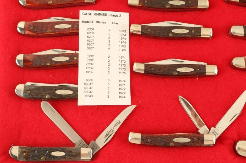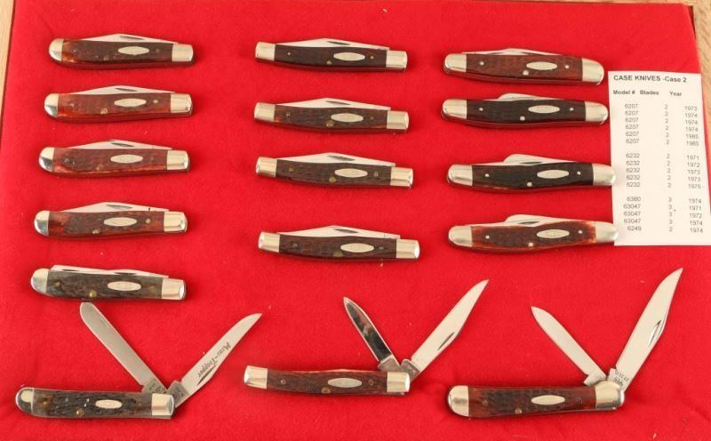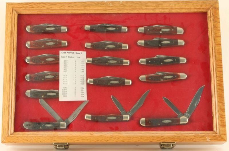 16 knives total including models 6207,6232, 63047, and others in wood display case with glass front. Measures 18"x12"x2".