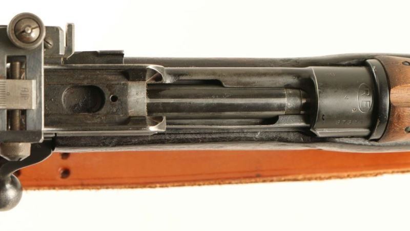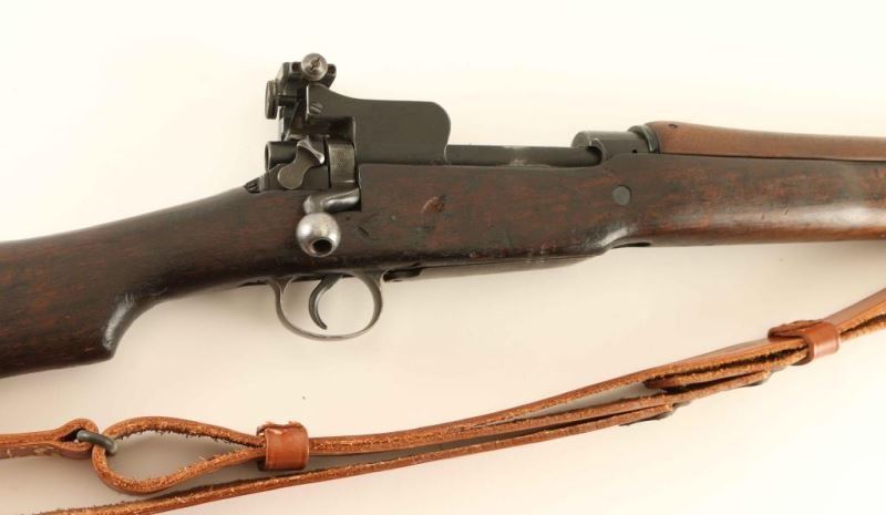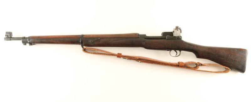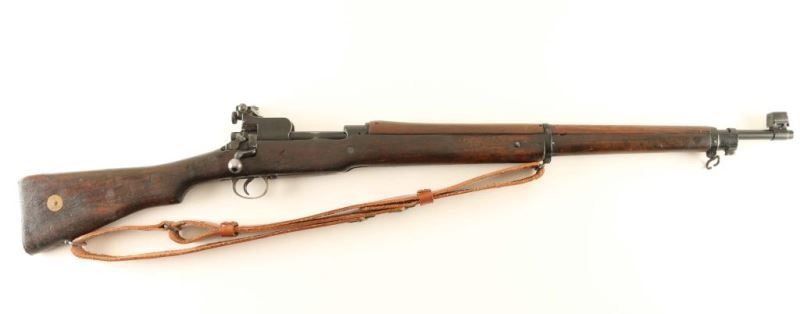 'No 3 Mk 1*r' British military magazine fed bolt action service rifle chambered in .303 British, manufactured in the United States circa 1914-1916. Features a blued/black painted finish, 26" barrel, shrouded patridge front sight, receiver mounted A.J. Parker adjustable rear sight with variable aperture diopter, front volley sight, metal forend cap/barrel band with bayonet lug & piling swivel, serrated trigger, internal 6 round box magazine, manual safety on the right side of the receiver, bent bolt handle, charge loading guide cuts in the receiver, brown leather sling, smooth wood handguard, 'Fat Boy' forend and straight grip shoulder stock with brass disc & metal trapdoor buttplate. The stock is marked "5CS/C.62" inside a circle, the stock disc is marked "B/2395," the bolt is marked with a "*" and the receiver is marked with a "RE" inside an oval/"*". Serial numbers match on the receiver and bolt handle. Rifle exhibits approximately 60% of it's finish showing thinned bluing on the receiver and edge wear and flaking on the black painted surfaces. Action is smooth, the bore is good and the wood stocks are good +. Condition is NRA Good+. ***C&R Firearm*** From The John F Sukey Collection