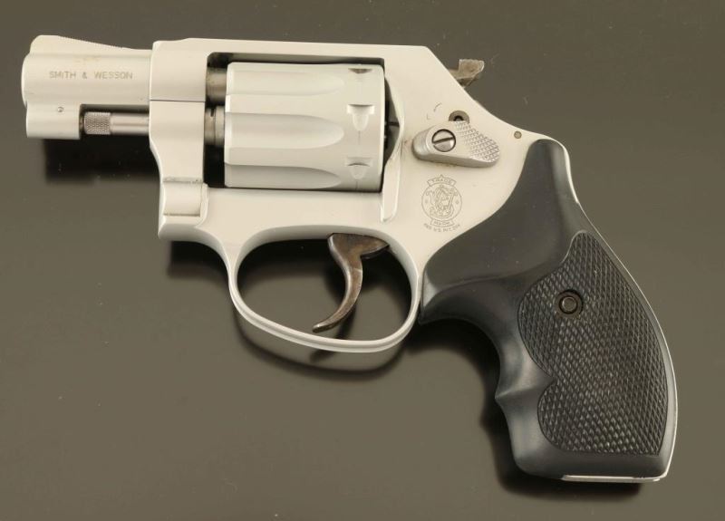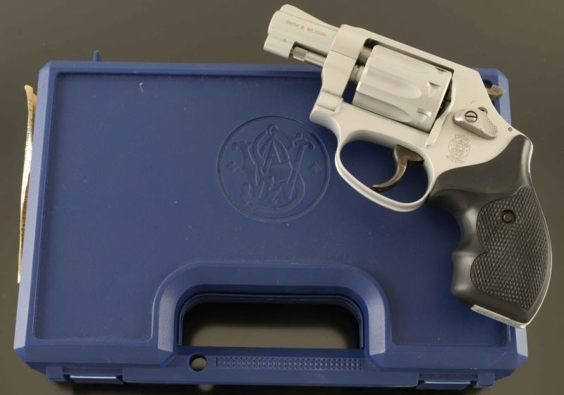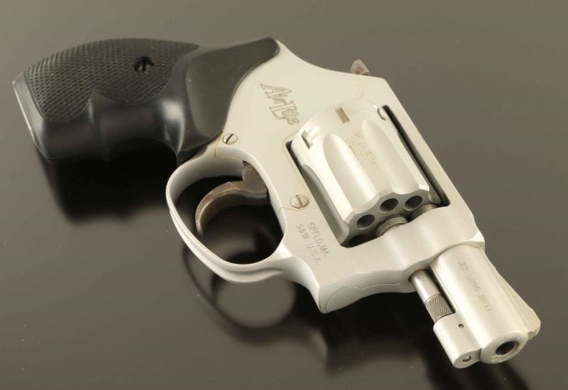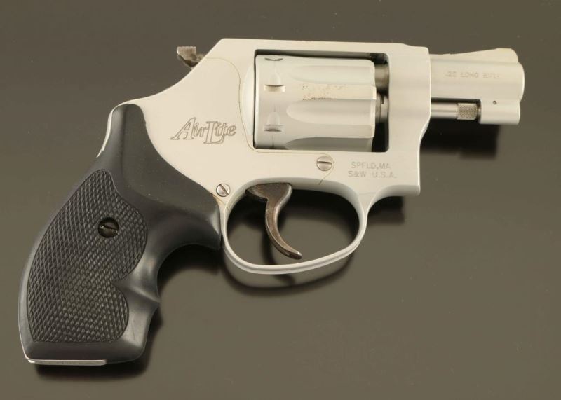 '.22 Airlite Revolver' Lightweight small frame double action revolver chambered in 22 long rifle, manufactured circa 1998. Features a satin alloy finish with S&W clear cote, 2" barrel, serrated ramp front sight, square notched rear sight,, non-shrouded ejector rod, fluted eight-shot cylinder with recessed chambers, smooth .312" combat trigger, .240" hammer, internal locking safety, three screw round butt aluminum alloy J Magnum frame and two-piece Uncle Mike's checkered black rubber wraparound grips. Includes a factory hard case with documents and paper. The revolver exhibits little wear but shows a few clusters of rust colored tones on the barrel, cylinder & backstrap. Action is strong with very good lock up, bore is excellent and the rubber grips are fine. Condition is NRA Very Good in box. ***Modern Firearm****
