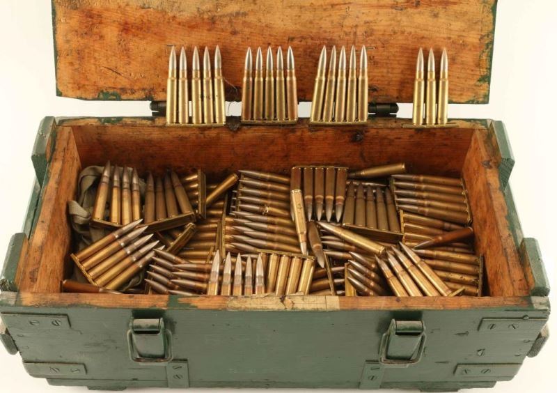 in wooden ammo box half full in 5rd clips 7.9FSI1944 From The John F Sukey Collection