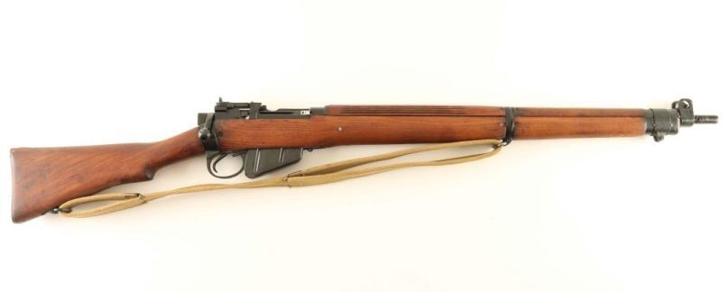 British military magazine fed bolt action service rifle chambered in .303 British. Imported by Century Arms of St. Albans, V.T. with import marks on the left side of the receiver. Features a black painted finish, 25.2" barrel with integral bayonet lugs, shrouded patridge front sight, receiver mounted flip-up aperture rear sight graduated to 1,300 yards, two barrel bands, smooth trigger, detachable 10 round magazine, manual safety on the left side of the receiver, tan canvas sling, integral charge loading guide cuts in the receiver, grooved full-length wood handguard, smooth forend with reinforcement screw, and straight grip shoulder stock with brass trapdoor buttplate. The receiver is marked with a "*" over the chamber and "NO 4 MK 2" on the left side. Serial numbers match on the receiver, bolt handle and forend. Rifle exhibits approximately 85% of it's mottled black finish with scattered wear & flaking. Action is smooth, the bore is very good and the wood stocks are very good+. Condition is NRA Very Good. ***C&R Firearm*** From The John F Sukey Collection
