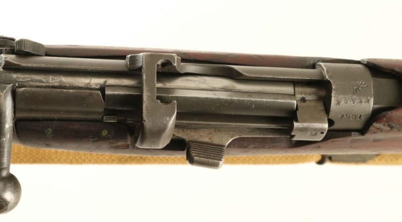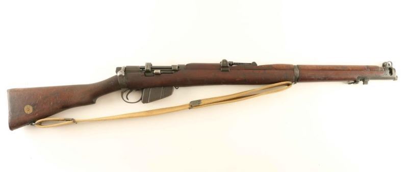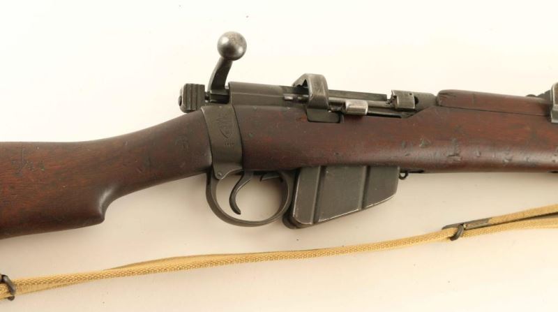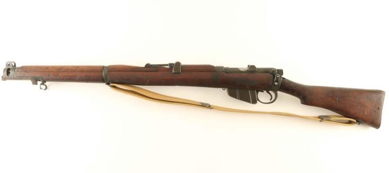 Australian military magazine fed bolt action service rifle chambered in .303 British, manufactured circa 1917. Features a parkerized finish, 25.2" barrel, raised patridge front sight, shrouded leaf type rear sight graduated to 2,000 yards, metal nosecap with bayonet lug, protective front sight ears & piling swivel, single barrel band, serrated trigger, detachable 10 round magazine with cut off on the right side of the receiver, manual safety on the left side of the receiver, tan canvas sling, charge loading bridge on the receiver, smooth full-length wood hand guard & forend and straight grip shoulder stock with brass disc & brass trapdoor buttplate. The right side of the butt socket is marked "A" inside a seven pointed star/"LITHGOW/SHT.LE/III" inside a shield & "1917." The brass disc is marked "59/BI." Serial numbers match on the receiver and bolt handle. Rifle retains approximately 90% of it's parkerized finish with the majority of the wear concentrated on the nose cap. Action is smooth, the bore is good and the wood stocks are good. Condition is NRA Good. ***C&R Firearm*** From The John F Sukey Collection